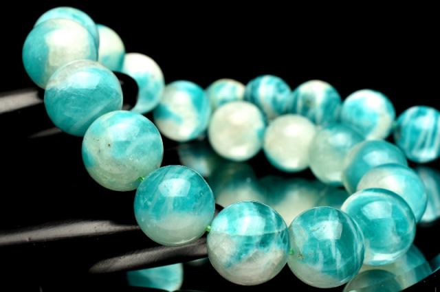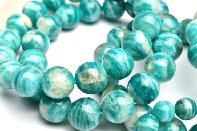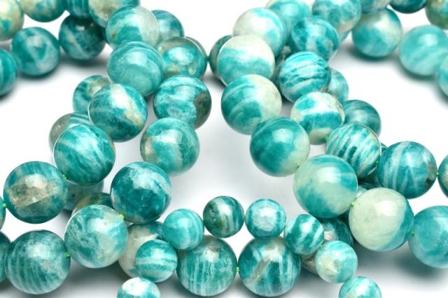 | 特徴・意味 | 従来のアマゾナイトが地殻変動によりシリカ(石英)浸透して出来たアマゾナイトシリカです。 ロシア産の特徴のゼブラ模様とシリカによって斑点模様が入り、一粒一粒個性的でオススメです。 アマゾナイトは英名はブラジルのアマゾン川に由来していますが、その流域では産出せず、アマゾン川流域で採れる色のよく似た石で、アマゾナイトと呼ばれていたものに由来しているようです。和名の天河石は、夜空のあまのがわに由来しています。 心を和ませてくれるような美しくやわらかな青緑色は、形成成分に含まれる鉛イオンによるものです。表面はガラス光沢か真珠光沢を放っており、四角柱状で産出することが一般的です。ほとんどが不透明で、ヒスイにも似た固体があり、それらはアマゾンジェードと呼ばれています。ヒスイの代用品として使われたこともあるようです。 |