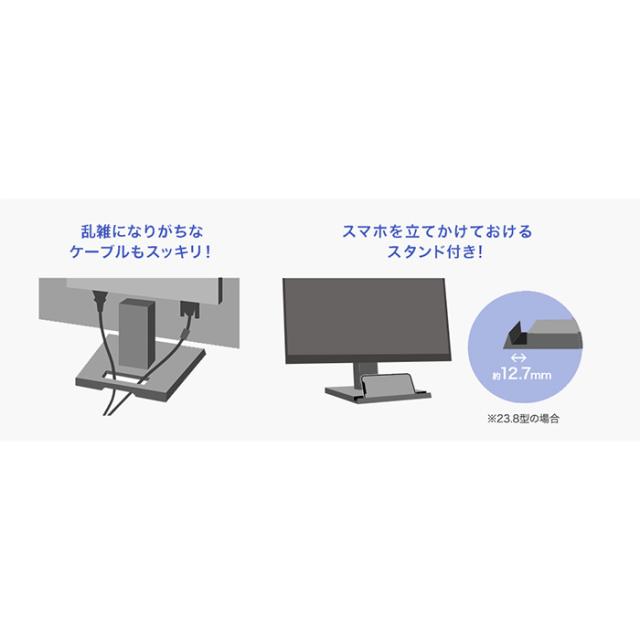 100Hz対応で視認性アップ!ノートPCへの給電も可能なUSB Type-C搭載 ●残像感軽減で視認性が向上 ●スッキリスタイリッシュなフレームレスパネルを採用 ●スマホスタンド&ケーブルホルダー付きスタンド ●目の負担をやわらげる「フリッカーレス」設計 ●黄色味を抑えながらブルーライトを低減させる「ブルーリダクション2」 ●コンテンツに応じた映像表示が出来る画面モード ●超解像技術により、低解像度の映像も美しく再現 ●ディスプレイアームやスタンドへの取り付けする際の共通規格「VESA」に対応 ●製品仕様 サイズ:23.8型 パネルタイプ:TFT23.8型ワイド パネル表面処理:非光沢 最大表示解像度:1920×1080 最大表示色:1677万色 外形寸法(W×D×H): スタンドあり:約540×215×407mm スタンドなし:約540×51×328mm ※突起部含まず 添付品:電源コード(PSE適合品)、HDMIケーブル、USBケーブル(C-C USB 5Gbps(USB 3.2 Gen1))、必ずお読みください、台座ネック、台座、台座ネック取付ネジ×2 ※記載は商品仕様の一部です。仕様説明不足等の理由での返品はできません。特に適合等は必ずご確認ください。