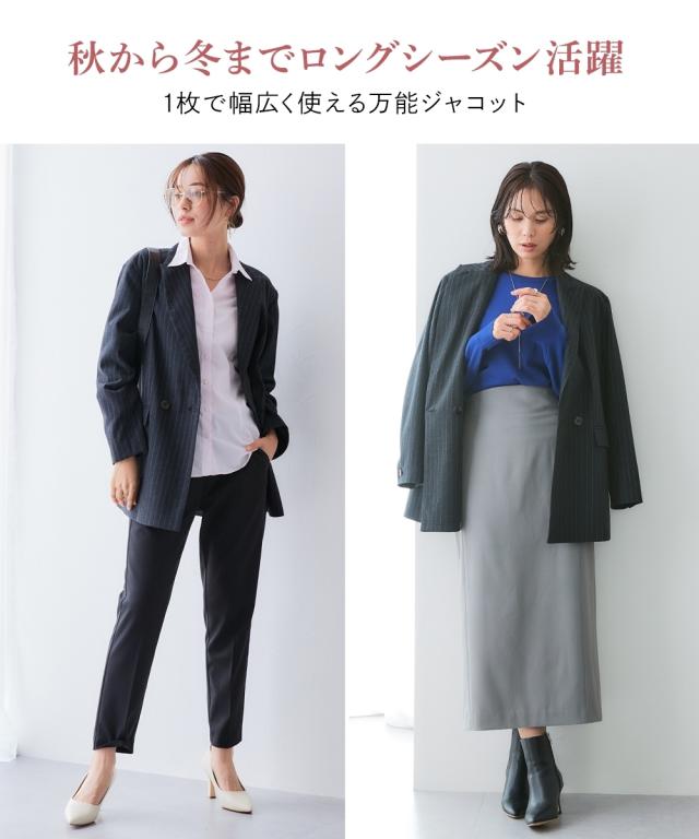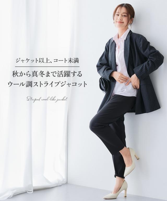 ジャケット以上、コート未満 秋から冬まで活躍するストライプ柄ウール調ジャコット■デザイン・ジャケット×コートのいいところ取り。オーバーシルエットで旬のスタイルに・オンでもオフで活躍。ストライプ柄とピークドラペルで高級感ある知的な印象。仕事服を軽やかにアップデートしてくれます・秋から冬までインナーを変えることでロングシーズン活躍します。■素材ウール調×ストライプ柄が映える素材感です■おすすめのスタイリングテーパードパンツやタイトスカートと合わせてスタイリッシュな印象に〜働く服〜nissenの通勤服専門ブランド。 仕事の日、休日、イベントの日まで、働く女性の毎日を商品やコンテンツを通して、自分らしく快適でいられる“働く服改革”をサポートします。