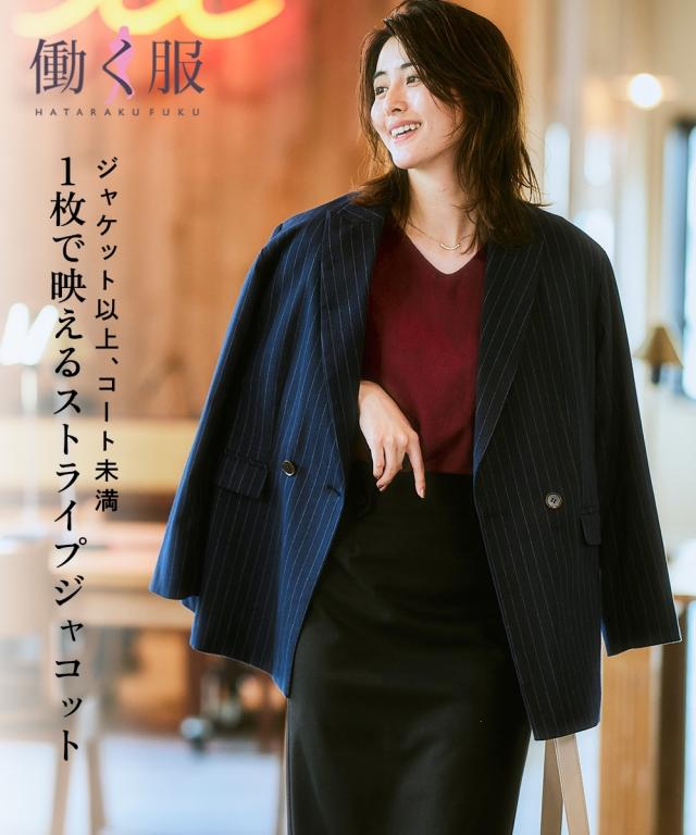 ジャケット以上、コート未満 秋から冬まで活躍するストライプ柄ウール調ジャコット■デザイン・ジャケット×コートのいいところ取り。オーバーシルエットで旬のスタイルに・オンでもオフで活躍。ストライプ柄とピークドラペルで高級感ある知的な印象。仕事服を軽やかにアップデートしてくれます・秋から冬までインナーを変えることでロングシーズン活躍します。■素材ウール調×ストライプ柄が映える素材感です■おすすめのスタイリングテーパードパンツやタイトスカートと合わせてスタイリッシュな印象に〜働く服〜nissenの通勤服専門ブランド。 仕事の日、休日、イベントの日まで、働く女性の毎日を商品やコンテンツを通して、自分らしく快適でいられる“働く服改革”をサポートします。