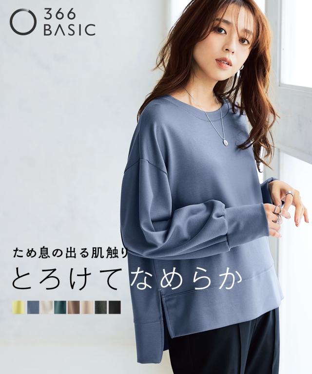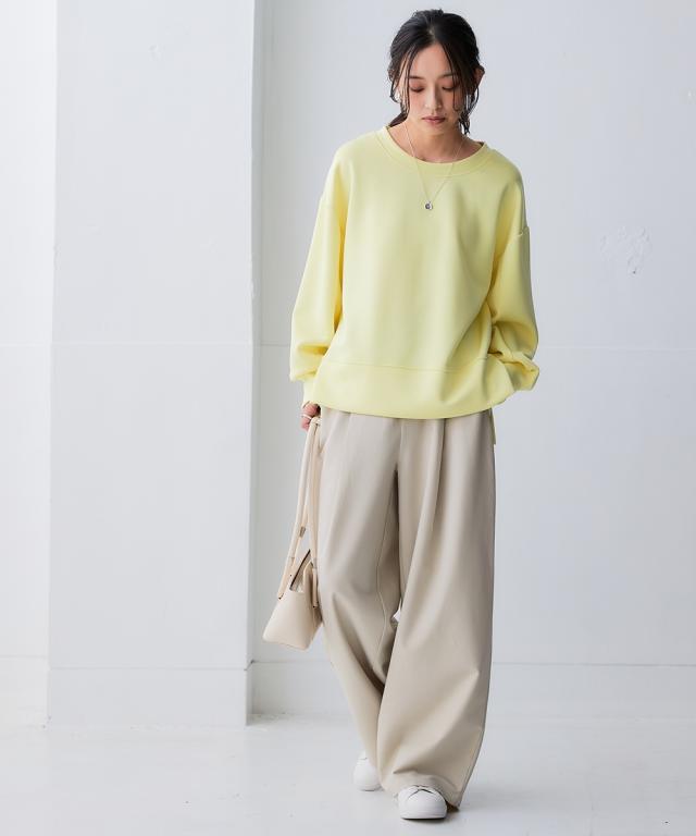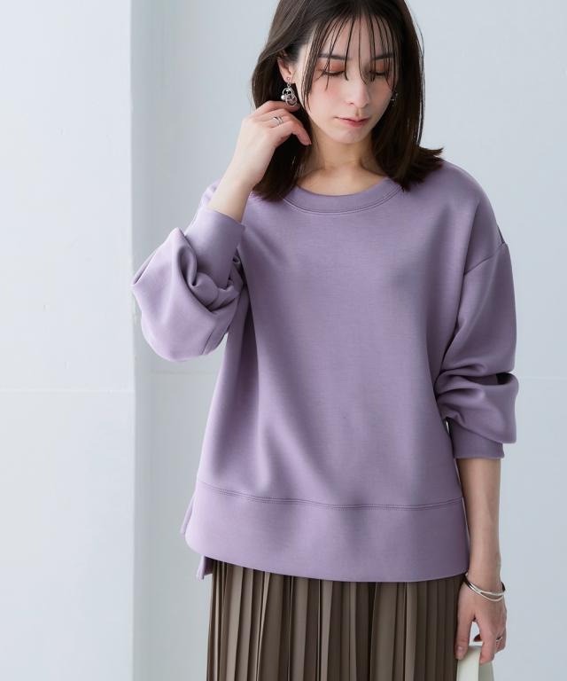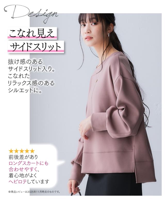 毎年大好評いただいている抜群の肌触りのポンチ素材シリーズ!好評につ新色を追加して再登場!前丈が上がりすぎて恥ずかしいというお客様の声から前後の丈差をサイズによって変更することでどのサイズの方も着やすくなりました!心地よい肌ざわり・ほどよい光沢感・適度なハリ感が特長の1枚。うっとりするなめらかな着心地です。■デザインややゆとりのあるオーバーシルエットのストレスフリーな着心地が魅力。程よくハリのある風合いが立体感のあるシルエットをキープし、体型カバーも叶えます。ドロップショルダーなので丸みのあるフォルムが女性らしいシルエットに。やや前後差のある着丈がバランス良く見せ、サイドスリットでさらに抜け感をプラス。なめらか素材のカジュアル過ぎない雰囲気が大人のスタイリングに馴染むアイテム。■素材生地に程良い光沢感とハリを持たせ、スウェットなのにきちんと感があり美しいシルエットを演出する、大人カジュアルスタイルにおすすめの1枚です。厚すぎず薄すぎない使いやすい厚みで、伸縮性も良く着やすいのがポイント。ハリのあるなめらかなポンチ素材なので、シワにもなりにくいです。■おすすめのスタイリング同素材のスカートと合わせて旬のセットアッ