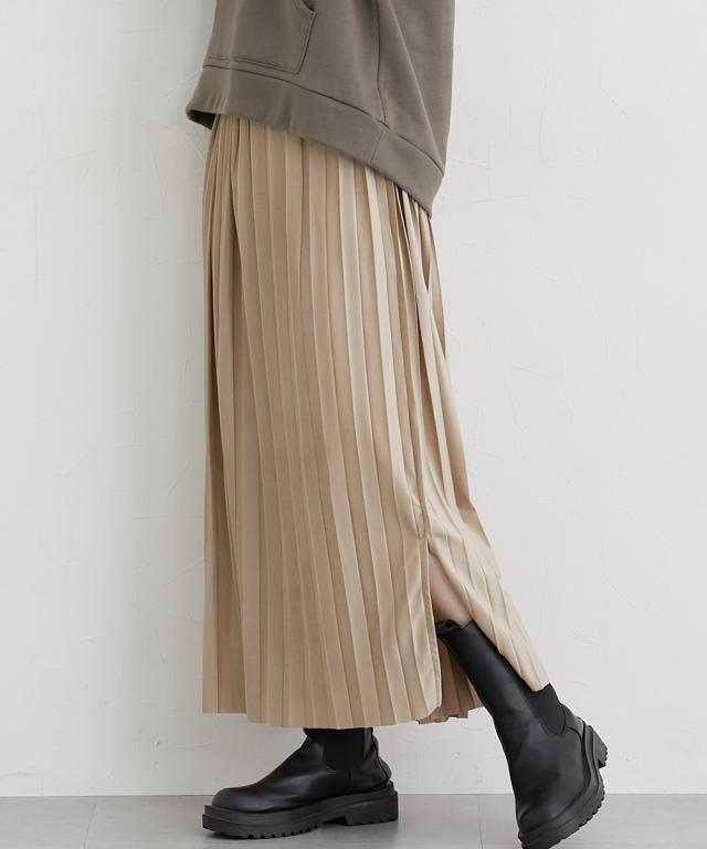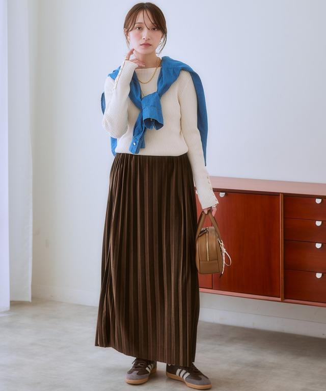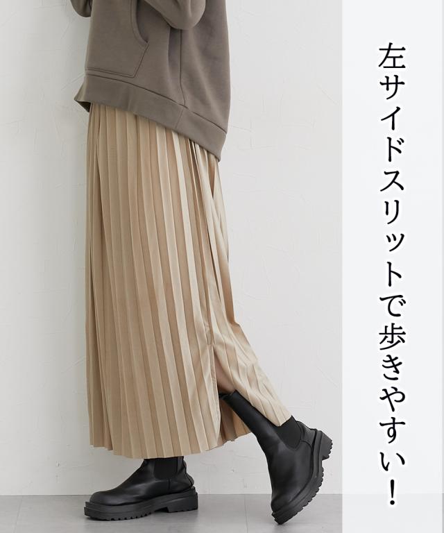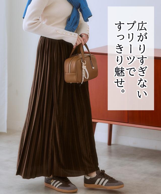 \毎日のコーデに頼れる万能ベロアプリーツマキシスカート/縦ラインですっきり細見え、体型カバーも叶うプリーツスカートオンもオフも着回し自由自在だから、デイリーカジュアルコーデにぴったり歩くたびにひらり揺れるプリーツが大人可愛いカラー違いで欲しくなる着回し力この秋の”買い足しスカート”はこれで決まり!!!■デザイン上品なマットな光沢感のあるベロア素材を使用したプリーツスカート大人っぽく見える様、やや太めのプリーツを施し着用しても広がり過ぎず細見えするようシルエットにこだわりました長めの丈感で気になる体型をカバーしつつ、左脇に施した深めのスリットが抜け感をプラスウエストはゴム仕様で楽な着心地ながら、きちんと見えも叶えますカジュアルにもきれいめにも着こなせる、着回し力抜群のアイテムです■素材ポリエステルをメインに使用しており、上品なマットな光沢感と滑らかな肌触りが特徴ですシワになりにくく、お手入れが簡単なのも嬉しいポイントポリウレタン混でストレッチ性があり、動きやすく快適な着心地です普段使いに最適な、ご家庭で手洗い出来る扱いやすい素材感です■おすすめのスタイリングカジュアルに着るなら・・・Tシャツやスウェットにスニカ