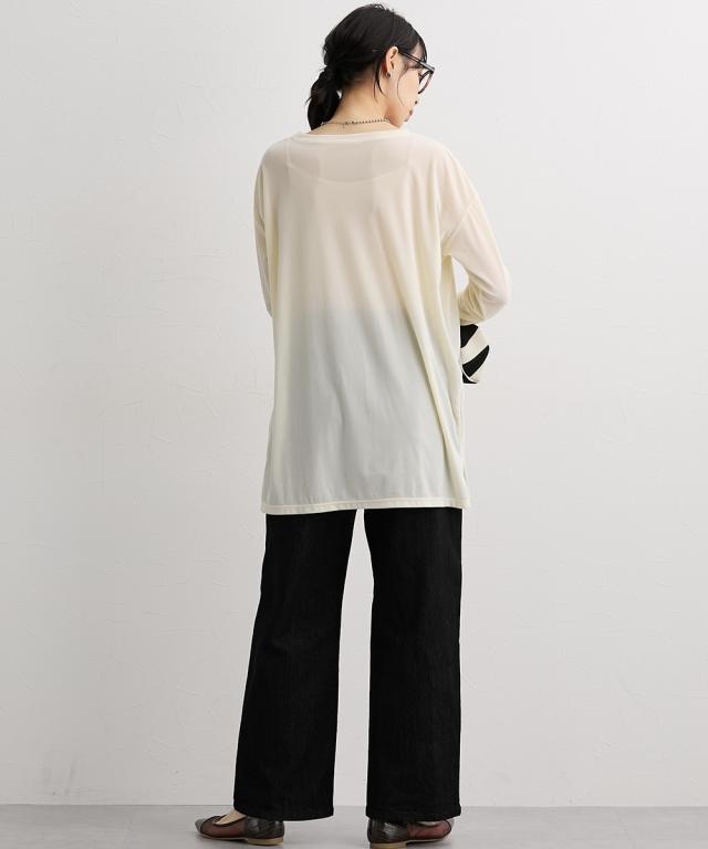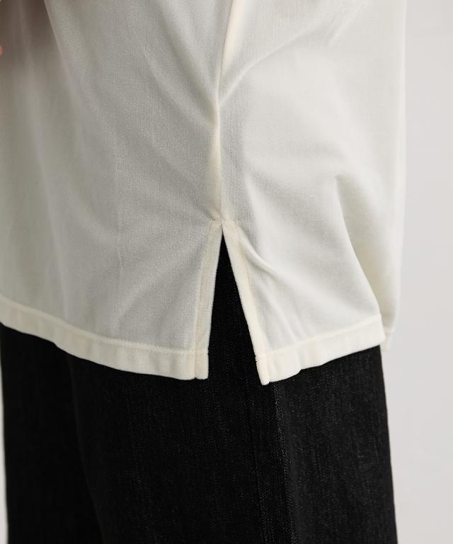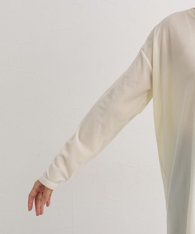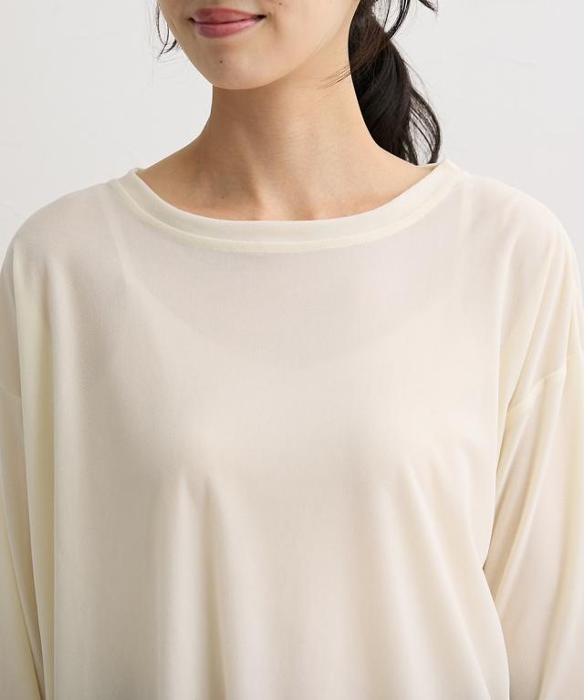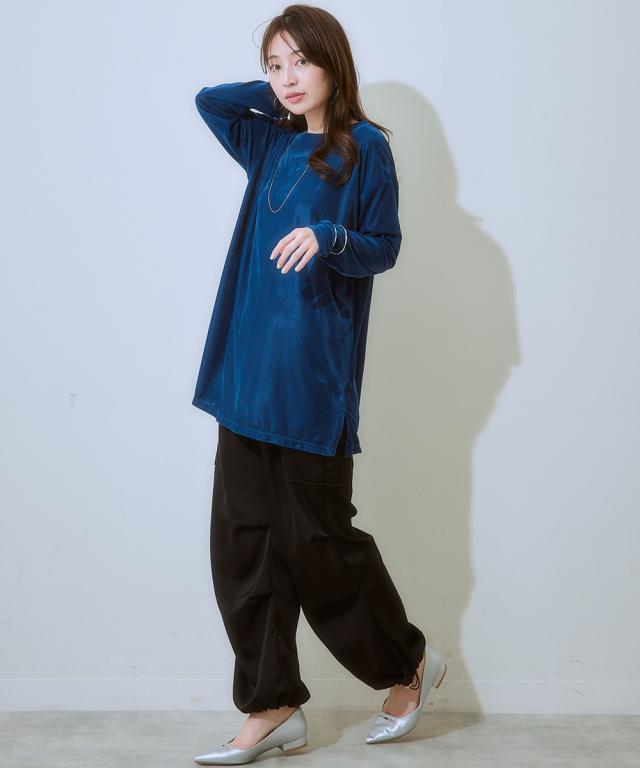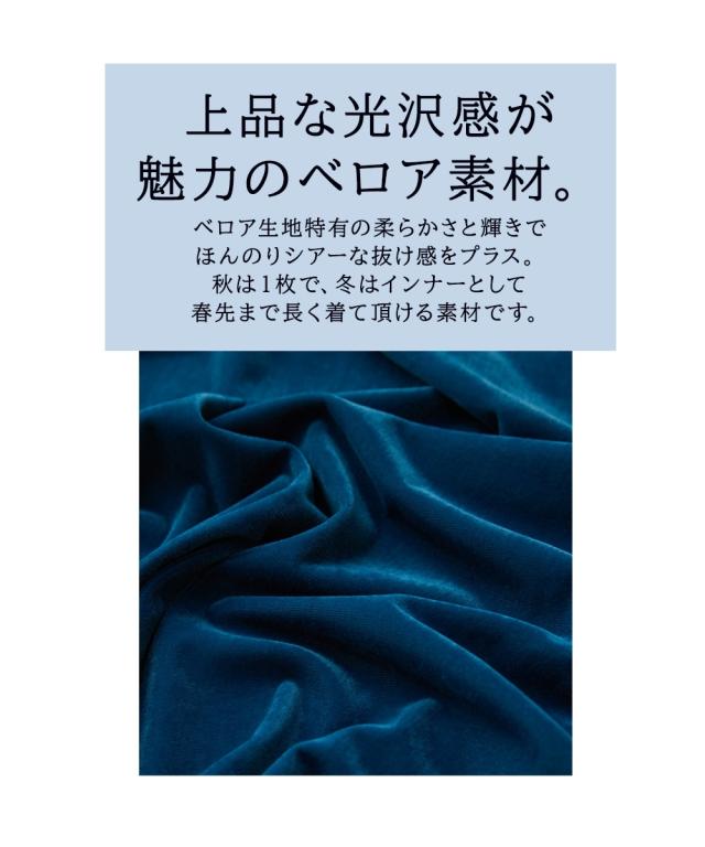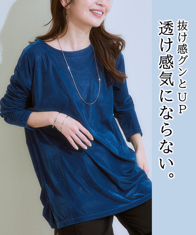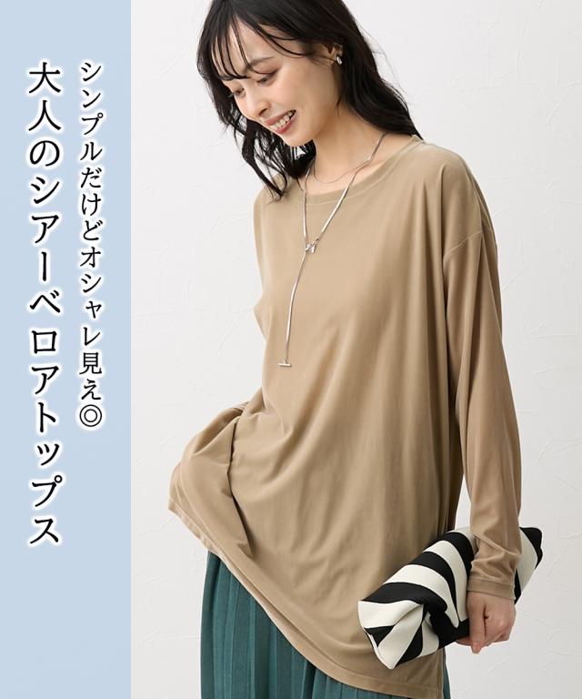 \光沢と透け感が上品。着るだけで大人の顔のシンプルトップス/程よい透け感と光沢感のあるシアーベロアが、日常にさりげない女性らしさをプラスシンプルだけど「今年らしいトレンド感」もある1枚で着るだけで旬顔にたっぷりゆとりのあるオーバーサイズでゆるっとラフに着られるのにベロア特有の上品な光沢感で高見え■デザイン抜け感のある程よい飽きのネックラインと、ゆるっとしたオーバーサイズのシルエットが気になる体型をふんわりカバーストンと落ちるシルエットで着痩せ効果も期待できます深めのラウンドネックは、デコルテを美しく見せ、女性らしさをプラス長めの丈感は、気になるヒップラインを隠してくれるのも嬉しいポイントです■素材ポリエステルをメインにしたほのかな透け感を光沢感が魅力のシアーベロア柔らかく、落ち感があり肌にやさしくなじむ上質感のある素材ですベロア表面の生地感にもこだわりふんわり軽く仕上げましたご自宅で手洗い可能なので、お手入れも簡単。毎日気兼ねなく着られるのが嬉しいポイントです■おすすめのスタイリング・キレイ目にきるなら・・・シアーベロアトップスにジャケット、テーパードパンツ+パンプスで上品なお仕事スタイルにも活躍・カジュアル