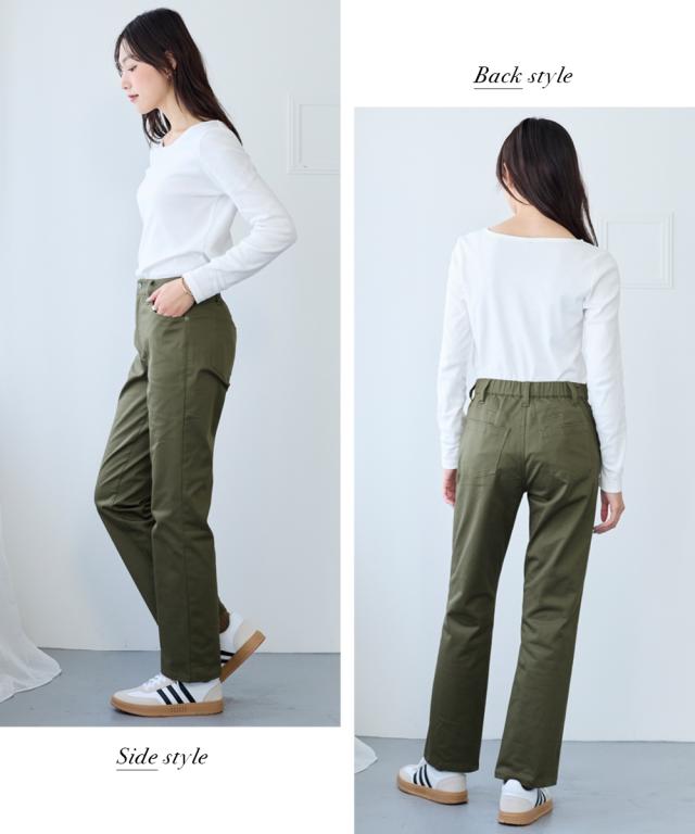 日常使いしたいベーシックなアイテムだからこそ、はき心地の良さで選びたい。ONでもOFFでもオールシーズン使える大人気ボトムを是非一度お楽しみください ■デザイン弊社の強みであるパターンにもこだわりが!!!股下に隙間ができにくい特殊なライン設計だからしっかりはき込めて脚の動きがスムーズです。ウエスト開きの角に丸みがあり、前かがみになってもラクちん。シンプルデザインで、すっきり見えるストレートシルエット。しっかり穿き込めるから脚長に見えるライン設計前後に便利なポケット付き足の可動域が広がり快適な動きやすさへ穿きやすさにこだわりヒップはゆったり設計・太ももはゆるっとゆったり設計■素材ヨコにグンと伸びるストレッチツイル素材で、はき心地がラク☆程よいハリ感の生地で着回しできる優秀パンツ■コーディネイトトップスを選ばず着回し自在