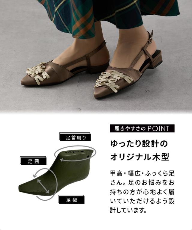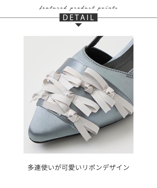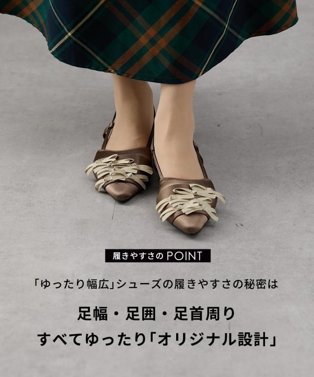 リボンがふんだんにトッピングされた、フェミニンなスリングバックパンプス。ほんのり光沢のあるサテン調の生地とポインテッドトゥで足元が上品にまとまります。低めかつ太めのヒールで安定感も抜群。フック式のストラップはお好みのサイズ感に合わせて5段階に調節できます。屈曲性のあるソールが足裏の動きに馴染むので歩きやすいです。低反発仕様の中敷きで優しい履き心地です。■ポイント・連なったリボンが可愛いデザイン・屈曲性が良く歩きやすい・低反発クッションの中敷き仕様で優しい履き心地・接地面が広く安定感のある太めのヒール・着脱楽ちんな引っ掛けるだけのストラップ・ストラップはお好みのサイズ感に合わせて5段階で調節可能・甲高、幅広、ふっくら足さんなど、足のお悩みをお持ちの方に心地よく履いていただける設計■ニッセンオリジナルの大きいサイズ規格本当に合う靴に出会った事はありますかニッセンの4Eは、靴底の幅を広げ、甲や足首周りもゆったりの独自設計。靴のサイズにお悩みのお客様へ向けて、サイズが大きくてもバランス良くきれいに見えるよう企画したオリジナルシューズです。