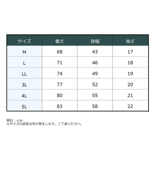 品質=身生地:ポリエステル73%・綿20%・レーヨン4%・ポリウレタン3%(ストレッチ天竺) 原産国:中国製 備考:洗濯機OK ※お洗濯は、必ず取り扱い表示にしたがってください。 単位:cm ※サイズの誤差は多少発生します。ご了承ください。