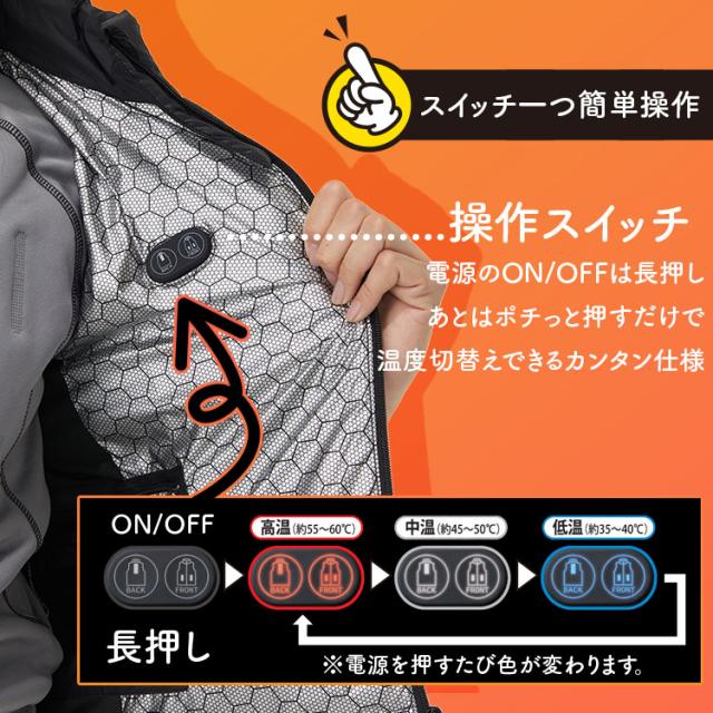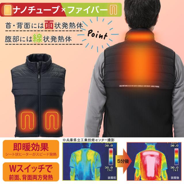 高機能発熱体「カーボンナノチューブ」×線状発熱体「カーボンファイバー」を配したハイブリッドヒートベスト。
