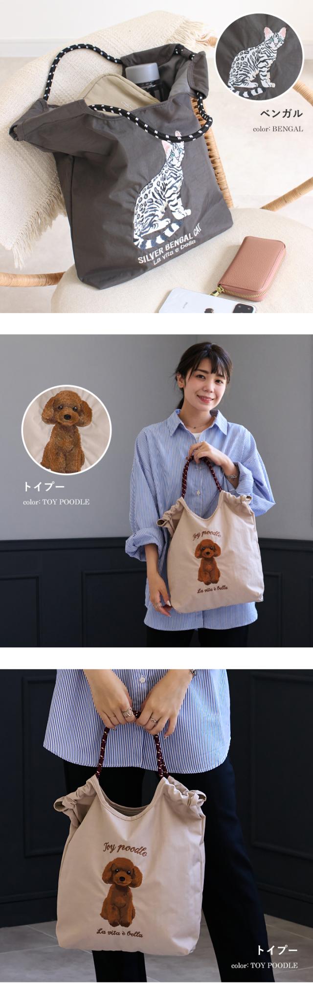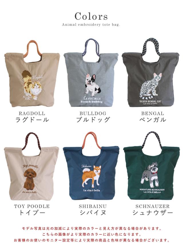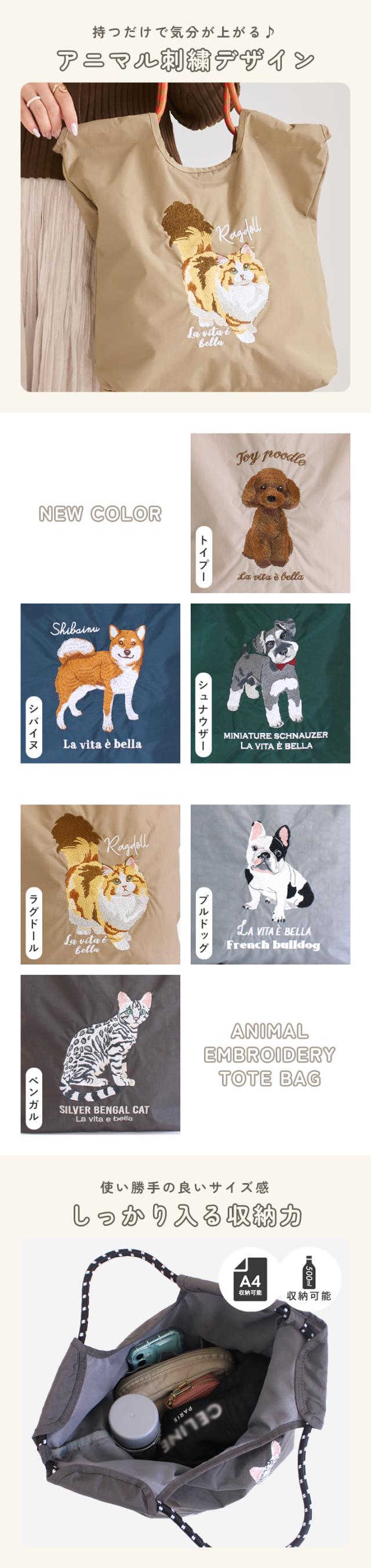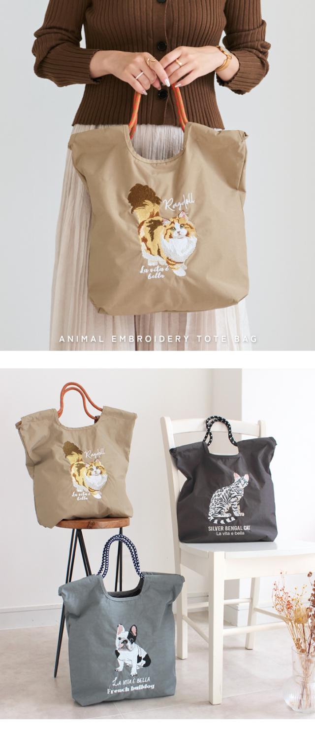 トートバッグ レディース 刺繍バッグ エコバッグ 刺しゅう ナイロン A4 肩掛け 手提げ 軽量 マチ広 ポケット付き 鞄 サブバッグ ショッピングバッグ かわいい おしゃれ 軽い 猫 ネコ ねこ 犬 イヌ いぬ スタイルオンバッグ 【yz-623-773】