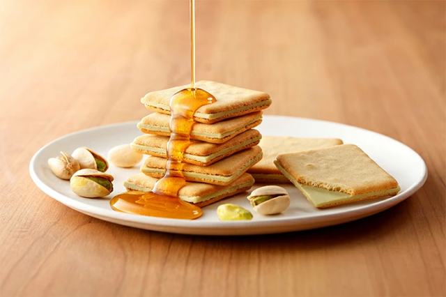 | 大人気メープルバタークッキーのピスタチオが期間限定発売 メープルシュガーを生地に練りこみ、サクサクと軽い食感に焼いたクッキーで香ばしいピスタチオチョコをサンドしました。 メープルの優しい甘みとピスタチオの深い旨味があわさり、ゆたかなコクをお楽しみいただけます。 ※チョコレートコーチングを使用 |