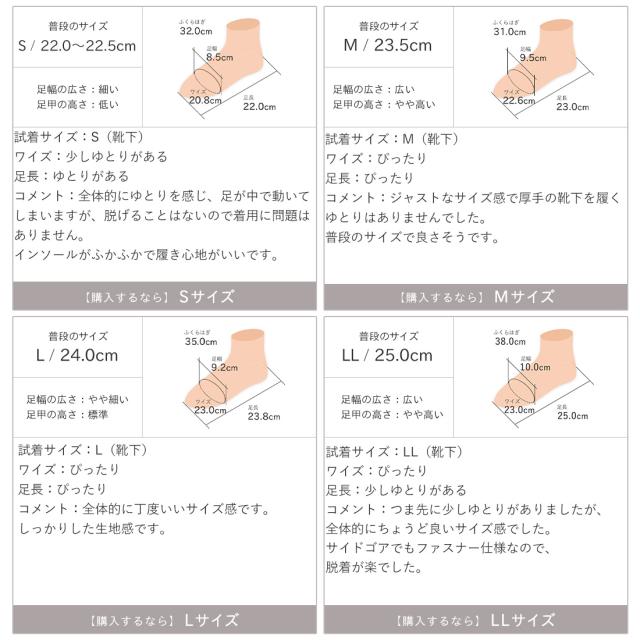甲高、厚手のソックスでの着用をご予定のお客様はワンサイズ大きいサイズのご検討をお願いいたします。