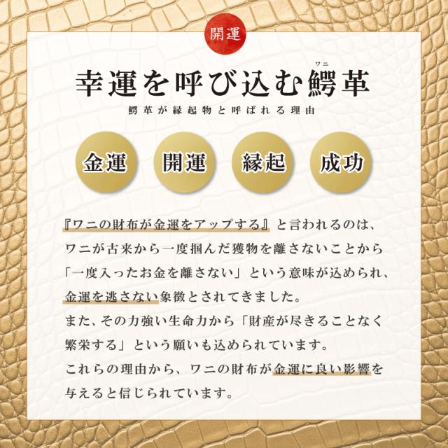 エキゾチックレザーの代表格である『クロコダイル』。 その圧倒的な存在感は美しく、ラグジュアリーな雰囲気を醸し出します。 経年変化によって、さらに美しい色艶が生まれていくのが特徴です。 ー商品の特徴ー ●一枚革仕立て 継ぎ目のない美しさ。 継ぎ目のない一枚革で仕立てた長財布は、クロコダイル一頭からごくわずかしかとれない希少な革を前面から背面にかけて贅沢に使用しています。 革本来の迫力と繊細な表情を、途切れることのない美しい鱗模様とともにお楽しみください。 ●無双仕立てのクロコダイル 外側だけでなく、内側にもクロコダイル革を贅沢に使用した「無双(むそう)仕立て」です。 希少な革を惜しみなく使うことで、耐久性と美しさを両立。使うほどに深まる風合いは、本物だけが持つ特別な魅力です。 ●センター取り&目地染め 唯一無二の、美しさ クロコダイル革の中でも、ごくわずかしかとれないお腹の中心部分を贅沢に使用したセンター取りの長財布。 目地部分だけを染める目地染めを施すことで、クロコダイルの鱗模様がより立体的に浮かび上がります。 ー商品詳細ー ●100万円もすっきり収納 100万円分のお束を入れても、かさばることなく入るマチ付き紙幣入れ。 100万円を入れてもスマートな形状を保ちます。 ●12枚のカードが収納可能 財布を開けば、すべてのカードがひと目で分かるカードポケット。 必要なカードがすぐ見つかります。 ●充実の収納フリーポケット 3ヵ所のフリーポケットがあり、クーポン券やギフト券、レシートなどを仕分けるにも便利です。 ●スムーズに開く小銭入れ 小銭入れには信頼のあるYKK製ファスナーを採用。小銭の出し入れもスムーズ。 【幸運を呼び込む鰐革 鰐革が縁起物と呼ばれる理由】 金運・開運・縁起・成功 『ワニの財布が金運をアップする』と言われるのは、ワニが古来から一度掴んだ獲物を離さないことから「一度入ったお金を離さない」という意味が込められ、金運を逃さない象徴とされてきました。 また、その強い生命力から「財産が尽きることなく繁栄する」という願いも込められています。 これらの理由から、ワニの財布が金運に良い影響を与えると考えられています。 【“革の表情”について、ご購入前にご確認下さい。】 本製品は鰐本革を使用しておりますので、キズやシワなども入っている場合がございます。 これらは本革ならではの個体差によるものと、2つとない表情を魅せる革の個性であるため、 風合いをお楽しみ頂けると幸いでございます。 ※ひどく目立つものは除いて、ある程度は革の個性としてそのまま出荷・発送致します※ ※上記のような革の個性による返品・交換は原則お受け致しかねますので、予めご了承下さいませ※ 【上記のような症状は使用する程に、徐々に革が馴染み目立ちにくくなっていきます。】 |