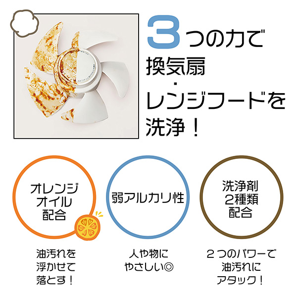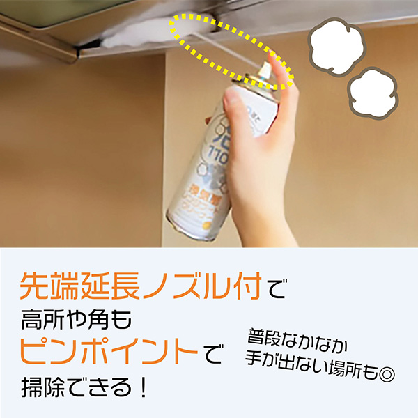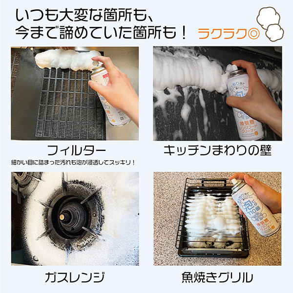 フィルター、キッチンまわりの壁、ガスレンジ、魚焼きグリルなど、消えにくいモコモコの泡が汚れに密着。浮かせて落とします。