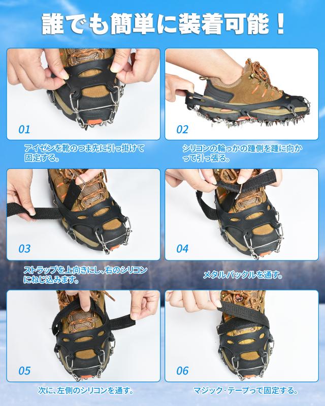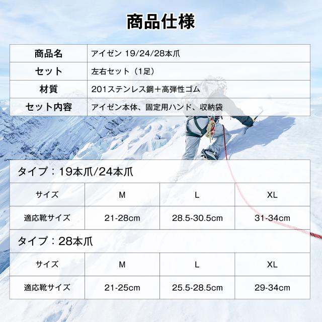 サイズは男女兼用の3サイズ:M、L、XLの3サイズがある男女兼用のアイゼンです。性別を問わず、すべての年齢層に適しています。 ※購入前にお客様が靴のサイズを予め測定してください。詳細の情報はサイズチャートを参考にしてください。
