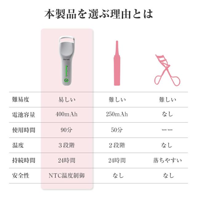 ★急速予熱&長持ち: 10秒の急速予熱で、忙しい朝でも1分で魅力的なまつ毛カールが実現。長持ちキープでまつ毛美人をサポート。