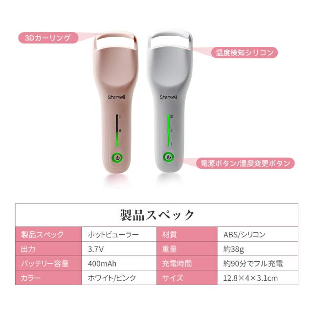 ホットビューラー 充電式 挟む 10秒急速予熱 38g軽量 3段階温度調節 操作簡単 初心者 自動電源OFF 火傷防止 usb 一重 奥二重 まつげカーラー カーラー型 挟むタイプ コテ型 プレゼント ホワイト