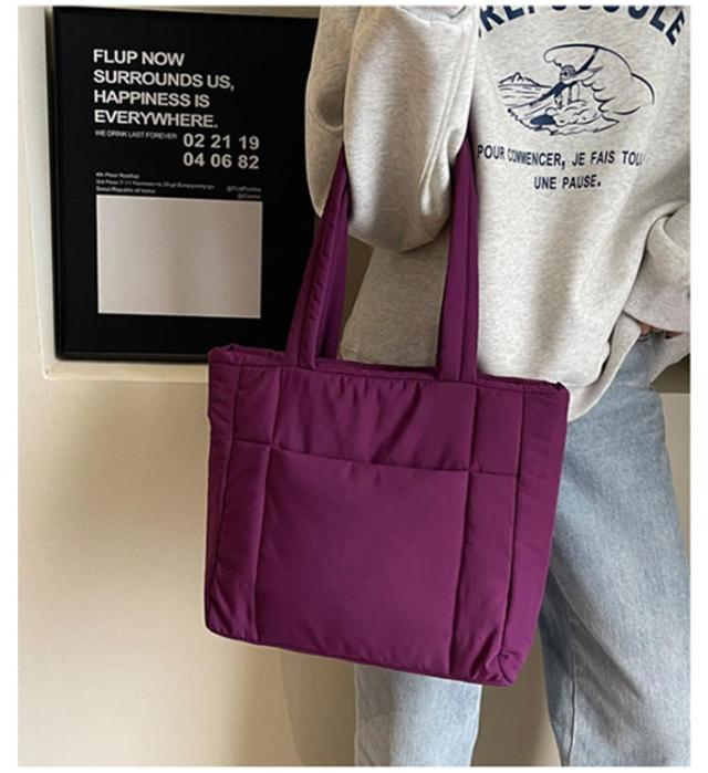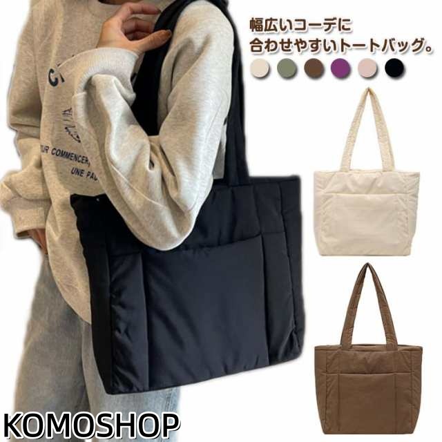 | 幅広いコーデに合わせやすいトートバッグ。 普段使いに丁度いいサイズ感のトートバッグ。A4サイズの書類や、化粧ポーチなど大きめな荷物をマチが広く入れやすく便利に使えます 中身をごちゃつきにくくしてくれるインナーポケット。すぐ出したいイヤホンやリップなど小さな小物を分けて入れられて便利! ティッシュペーパーやスマホを収納しやすいアウトポケット。 サッと肩に掛けやすく厚手の服を着ていても持ち歩きやすい長めのハンドル。 柔らかな立体感のあるキルティング生地カジュアルな印象を与えてくれる中綿入りの素材。 | |