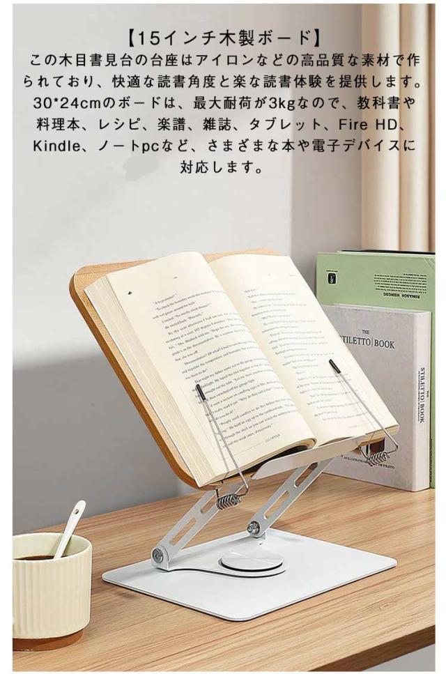 | 金属台座×木ボードのブックスタンド。【360度回転式?無階段高さ調節?折りたたみ式】 【15インチ木製ボード】この木目書見台の台座はアイロンなどの高品質な素材で作られており、快適な読書角度と楽な読書体験を提供します。30*24cmのボードは、最大耐荷が3kgなので、教科書や料理本、レシピ、楽譜、雑誌、タブレット、Fire HD、Kindle、ノートpcなど、さまざまな本や電子デバイスに対応します。 【無階段高さ調節&360度回転可能】台座は360度スムーズに回転できます、読書やお仕事中に本や設備の角度を変えるのが便利です。高さ調整範囲は4.4-39 cmなので、本を目線の高さに合わせることができ、首、肩、腰への負担を軽減します。お子様から成人、お年寄りまで利用できます。 【安定性抜群&折りたたみ式】ベース台座のサイズは23.5*18.5cm、裏側にシリコンが付きますので安定性抜群、金属の台座がデスクを傷つける心配もありません。精密に加工されたアイロン製の金属部品が、使用中の揺れを防ぎます。折り畳み式ブックスタンドは収納便利で、持ち運びやすい。ボードの丸みを帯びたエッジはユーザーフレンドリーで、使用、持ち運び、収納の安全性が保障されます。 【さまざまなシーンに対応】この多機能ブックホルダーは、キッチン、ホームオフィス、リビング、書店や図書館、学校や大学、練習室、オフィス、カフェなどさまざまな場所で活躍します。 【インストール不要】この製品は組み立て不要で、すぐにご利用いただけます。 | |