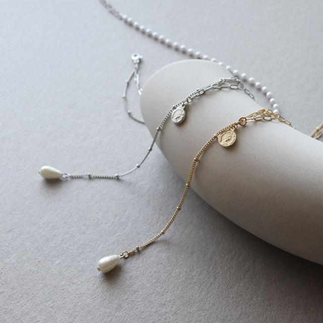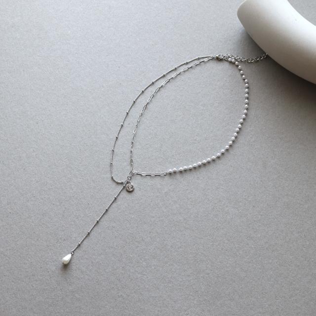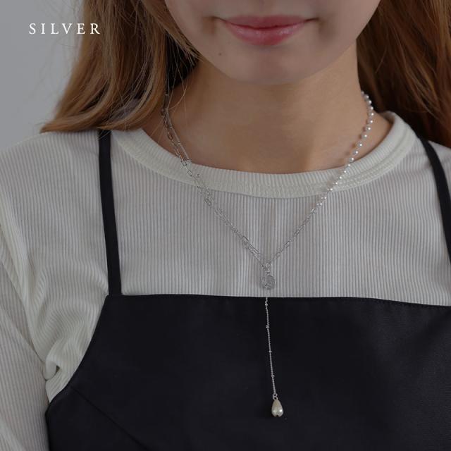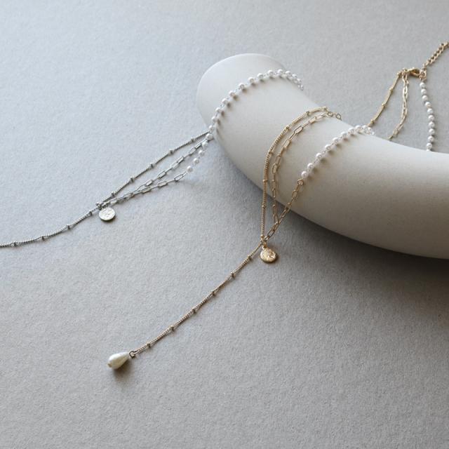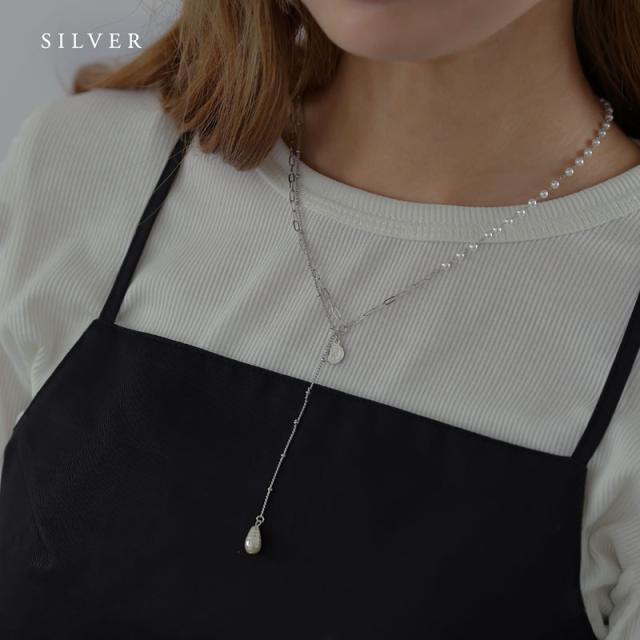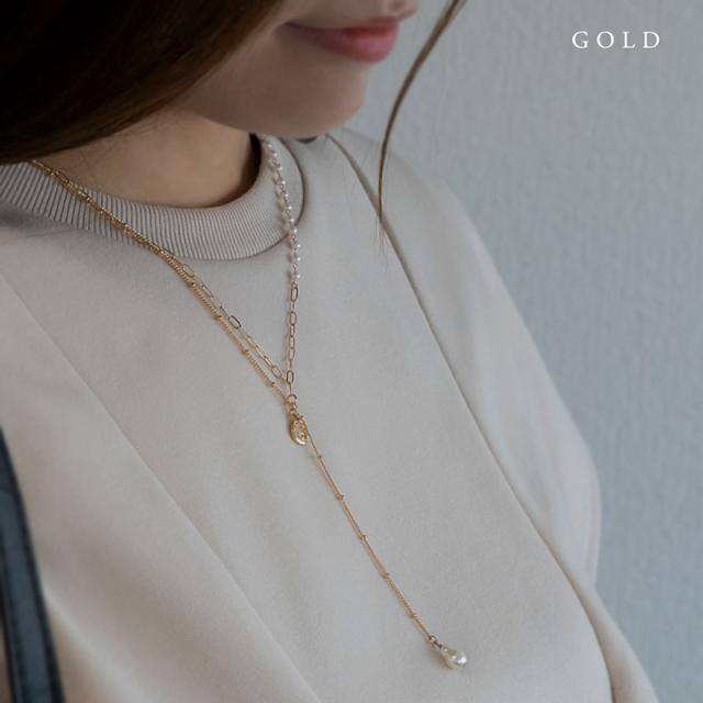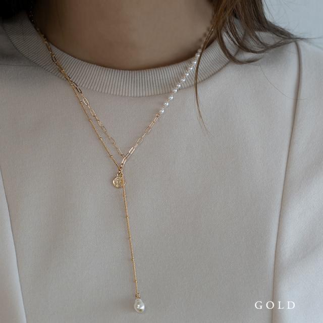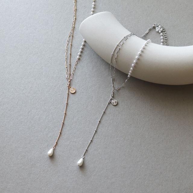 異なる2種類のメタルチェーンにパールチェーンのY字ネックレス。