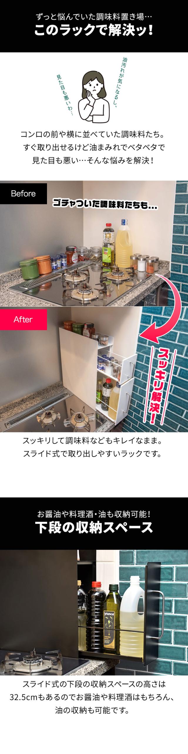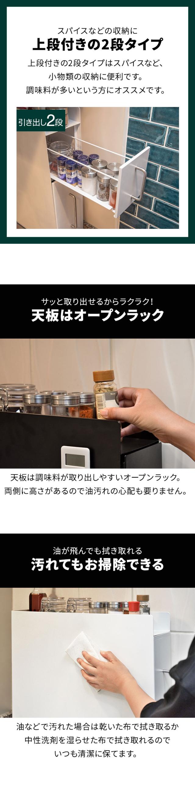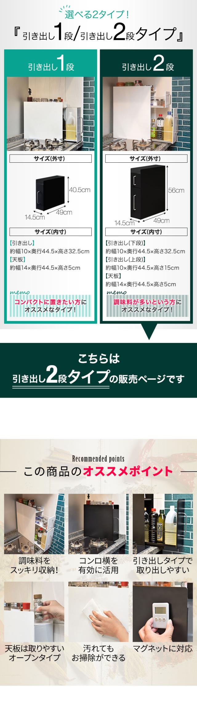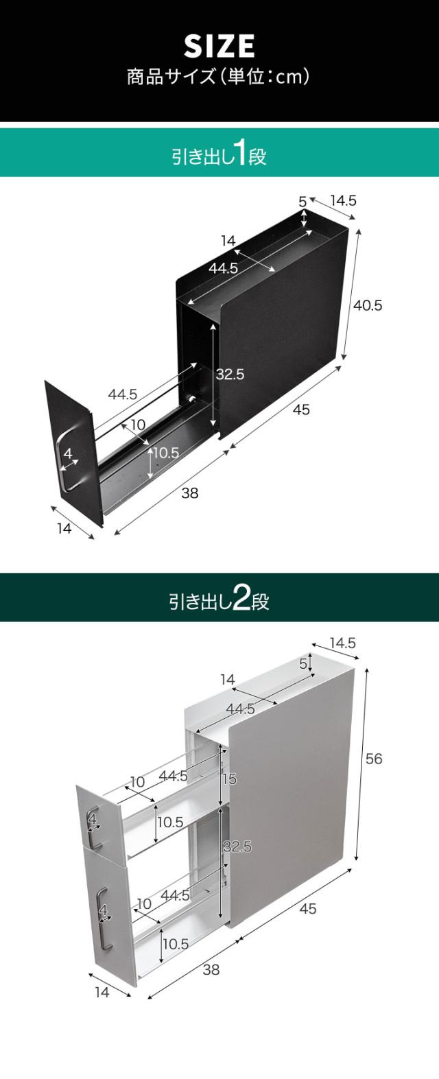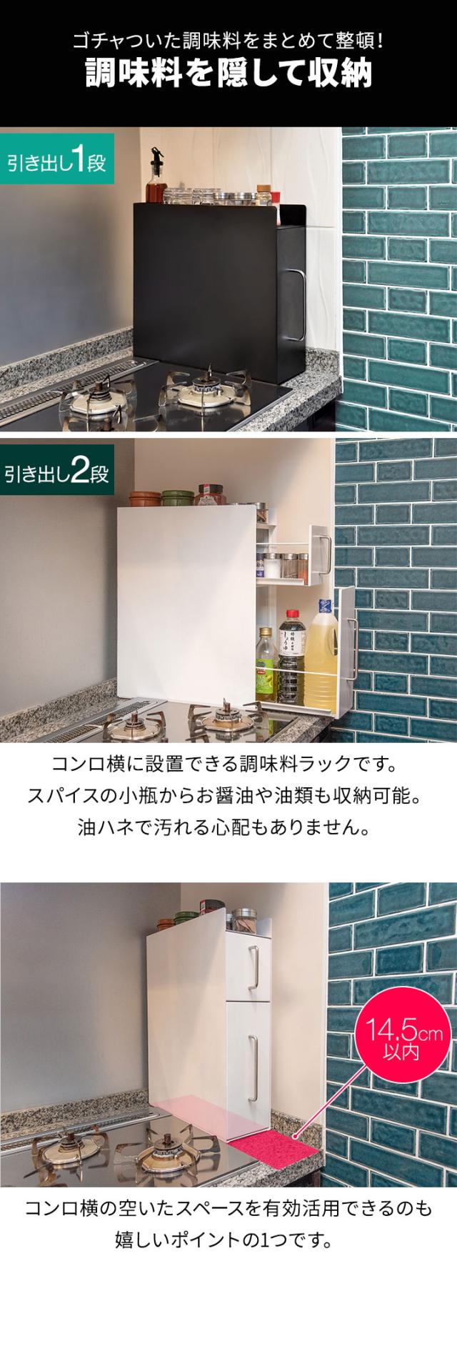 キッチン収納 調味料ラック 隠せる調味料ラック 上下 2段 スリム 幅14.5cm 奥行45cm 高さ56cm スライド引き出し 隙間収納 調味料ストッカー 送料無料