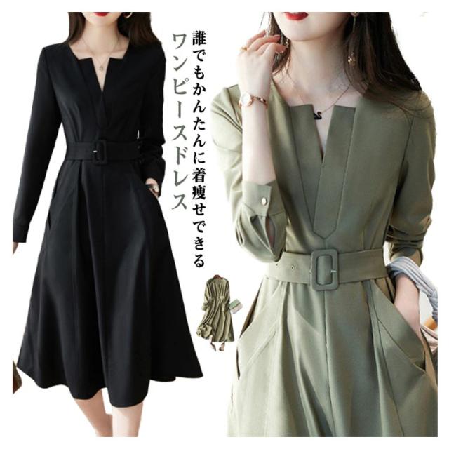 ドレスワンピース 長袖 40代 入学式 卒業式 Aライン フレアワンピース Vネック 着痩せ 学校行事 面接 オフィスカジュアル 長袖ワンピ 送料無料 春 秋 セレモニー ワンピース スーツ フォーマル ポケットあり 膝丈 OL ママ 七五三 30代