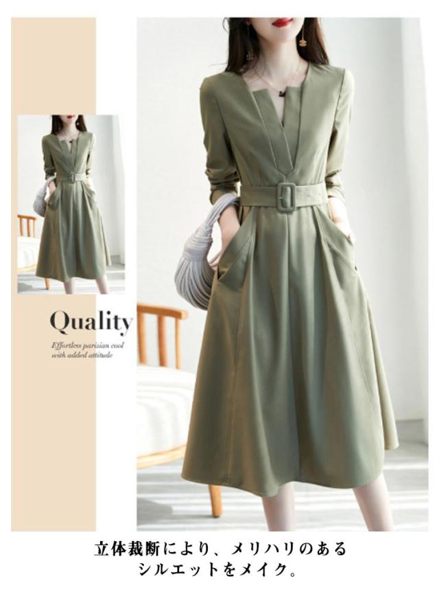 | 誰でもかんたんに着痩せできるワンピースドレス。 立体裁断により、メリハリのあるシルエットをメイク。 顔周りをすっきりみせてくれるVネックデザインが特徴的。 広がりすぎないフレア感とAライン&スリムなシルエットで、女性らしさを演出。 結婚式の二次会やパーティー、演奏会、お呼ばれ等のフォーマルな場面で、知的な印象を与えてくれます。 秋、冬の寒い時期には、上にジャケットやコートを着たり、春、夏には1枚でコーディネートが完成する長袖ワンピース。 普段使いはもちろん、冠婚葬祭も大活躍、1枚あるとあらゆる場面で対応! | |