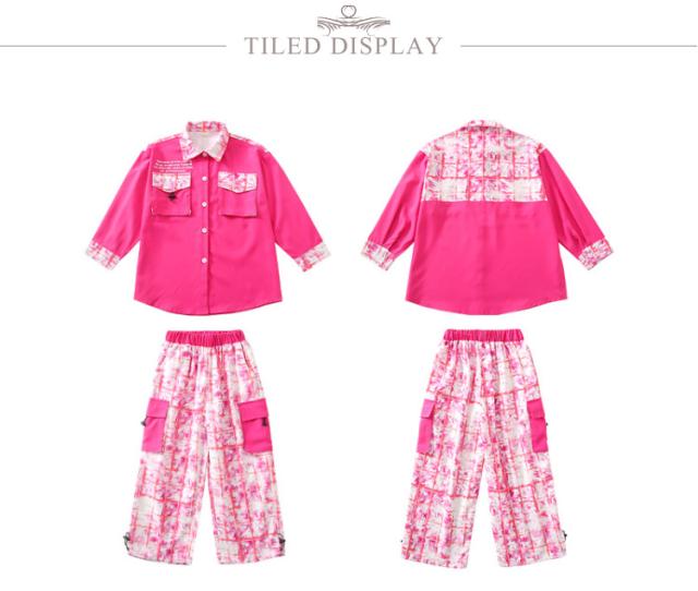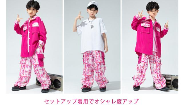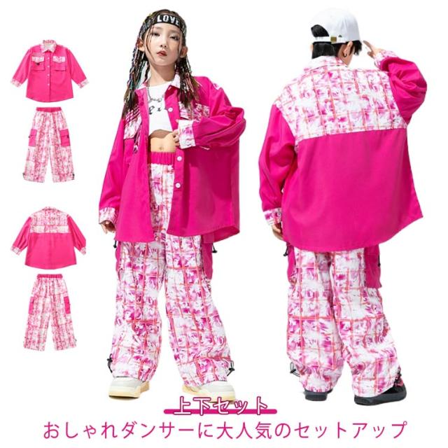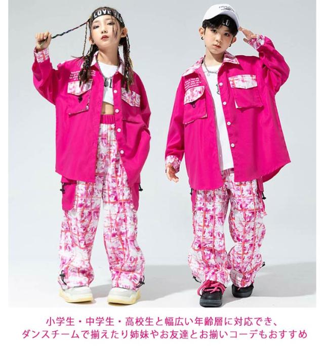 ダンス衣装 キッズ セットアップ 上下セット 男の子 女の子 ヒップホップ ダンスウェア ヒップホップ ステージ衣装 長袖 シャツ ロングパンツ イージーパンツ ウェストゴム 発表会 K-pop 舞台 団体服 演出服 総柄 おしゃれ きれいめ イベント衣装