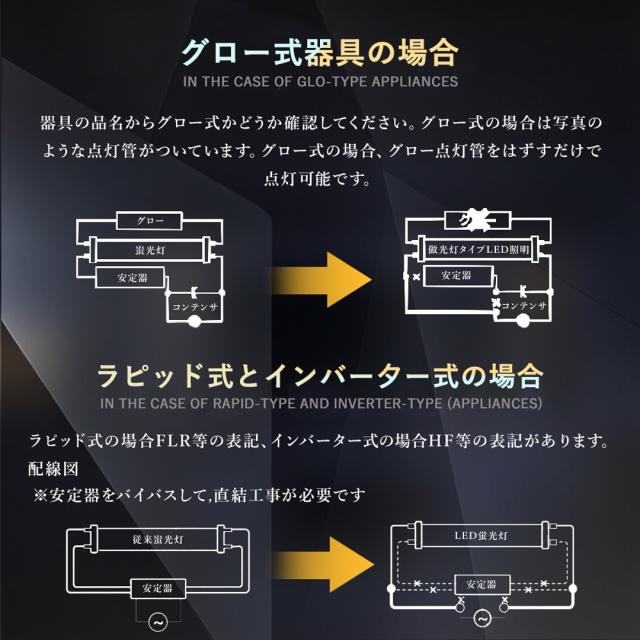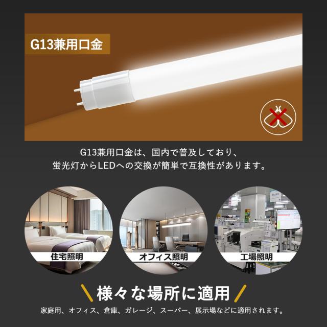 - 本製品が従来の蛍光灯器具(G13ソケット)と互換性があり、交換時に器具全体を変更する必要がなく、改造コストを抑えられます。 一部のモデルはインバーター不要の「直接接続型」で、配線を簡略化し、施工時間を短縮します。