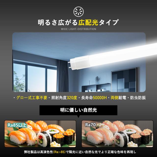 - Ra85以上の高演色性を実現しており、物体の色再現性が優れ、業務用や商業施設での視認性向上に貢献します。直管型の形状に合わせた光学設計により、むらのない安定した照明を提供し、目の疲れを軽減します。