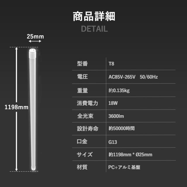 【グロー式工事不要】LED蛍光灯 40w形 T8 直管 LEDランプ 1198MM 直管型LED蛍光灯 LED蛍光管直管 LED蛍光灯 40W形 直管 120CM 40W型 LED直管蛍光灯 FL40ss 消費電力18W 高輝度3600lm G13口金 天井照明 家庭用 倉庫/工場照明 オフィス