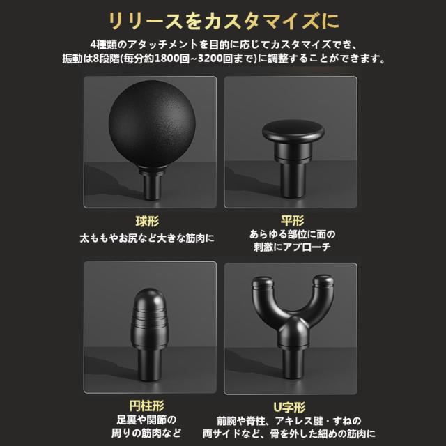 4種類のマッサージヘッド: マッサージガンは筋肉を活性化し、血流を刺激し、筋肉の回復時間を大幅に短縮し、痛みを和らげ、一度マッサージして、長い間リラックスすることができます。