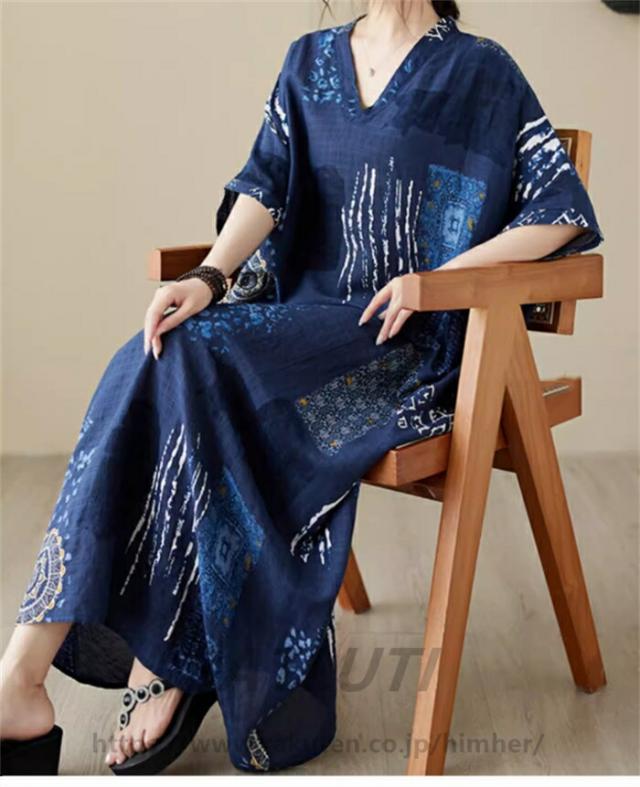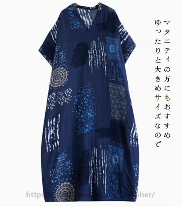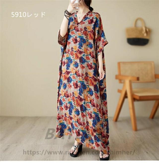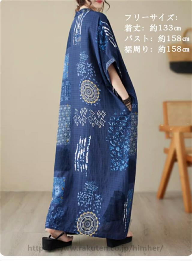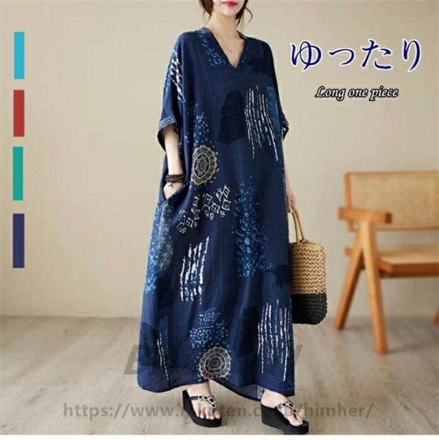 ロングワンピース ゆったり 和風 半袖 レディースファッション 超目玉商品 5909ネイビー 5904ネイビー 5910レッド 5910グリーン 5911ブルー