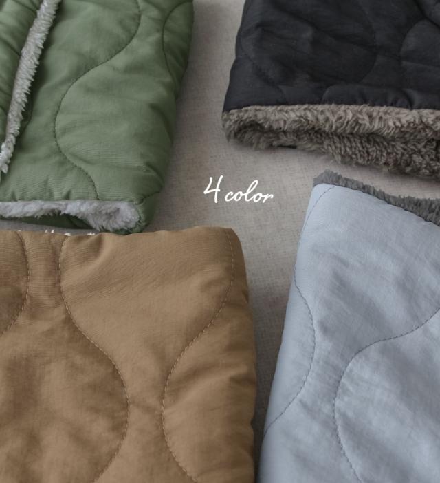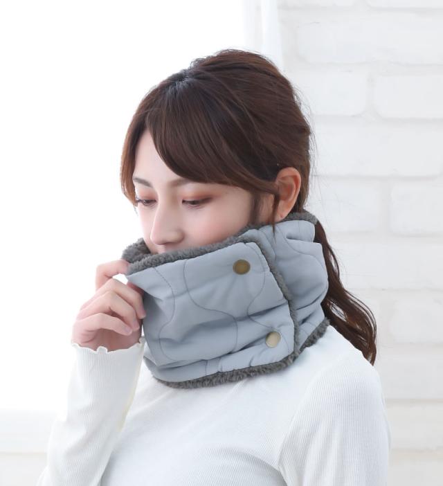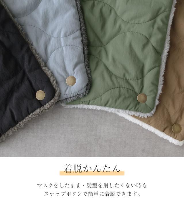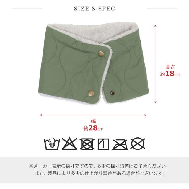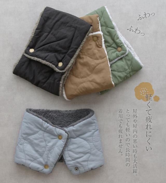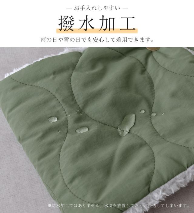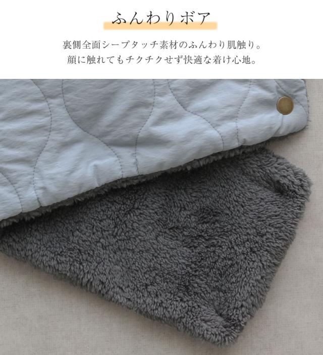 撥水キルトのネックウォーマー。撥水加工を施しているので、雨の日や雪の日でも安心して着用できます。裏側全面がシープタッチ素材なのでとってもあたたか。スナップボタンで簡単に着脱可能です。オシャレにあたたかく、機能性もバッチリ◎
