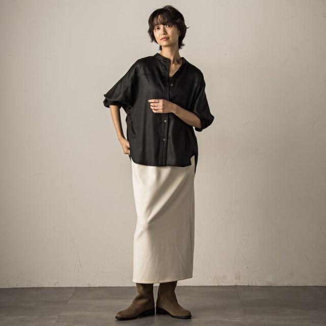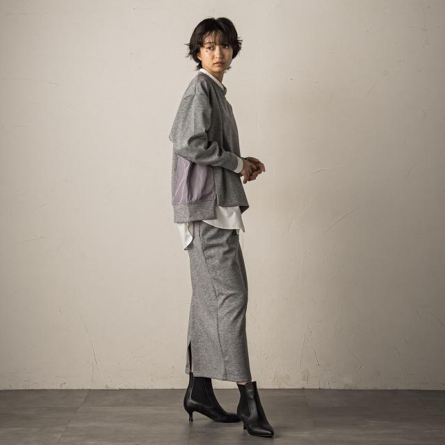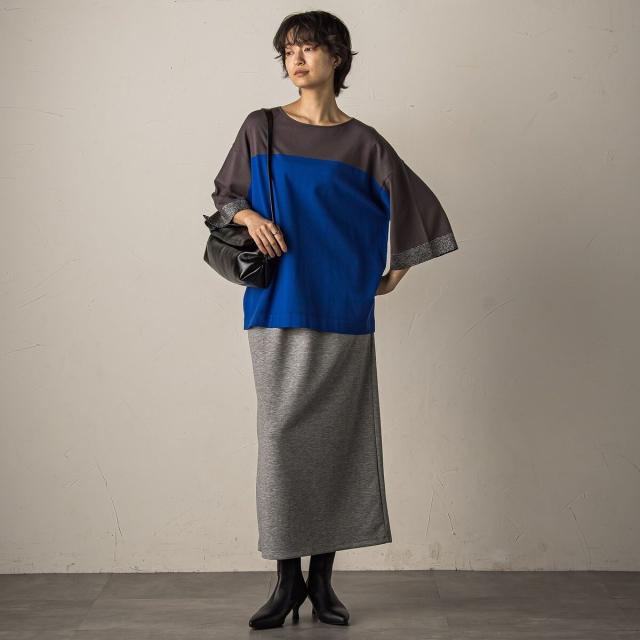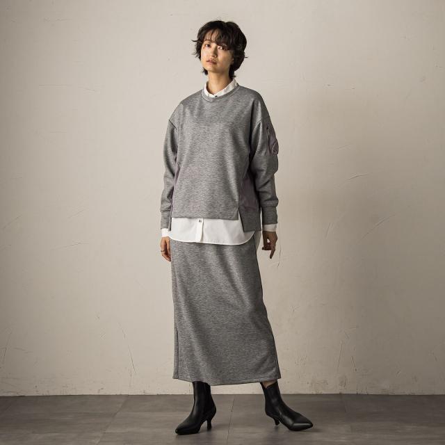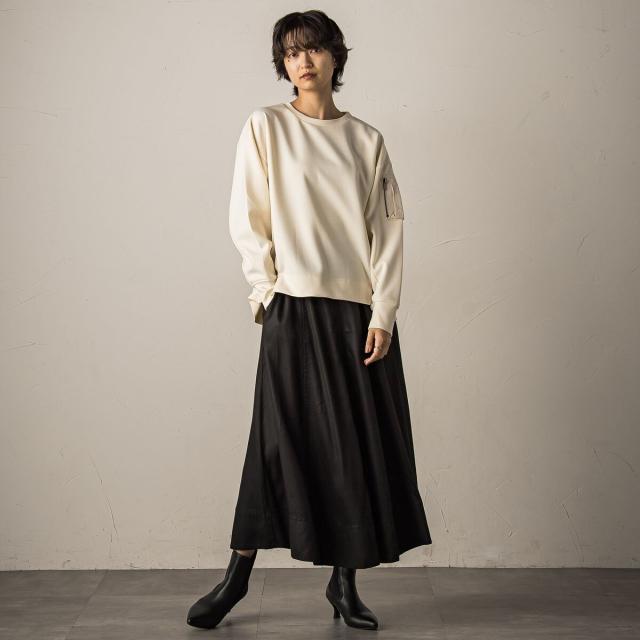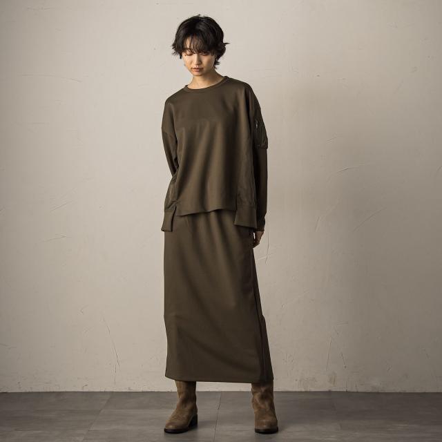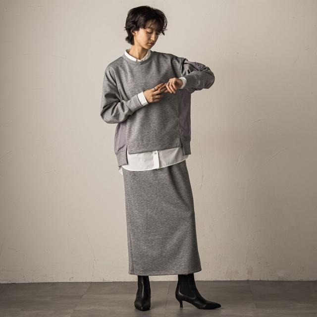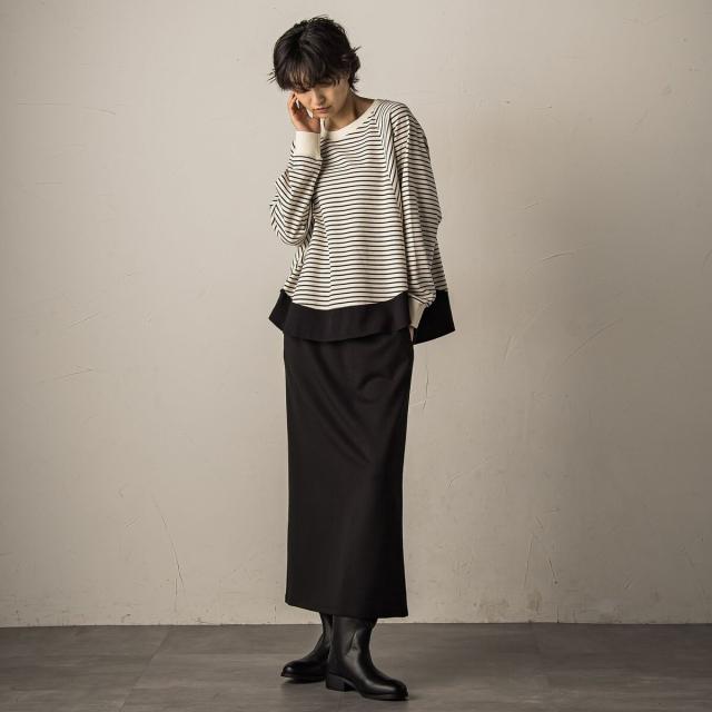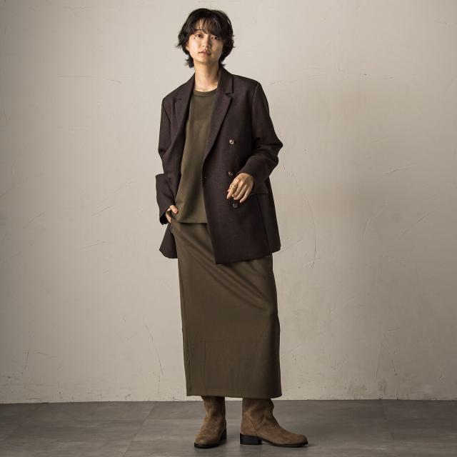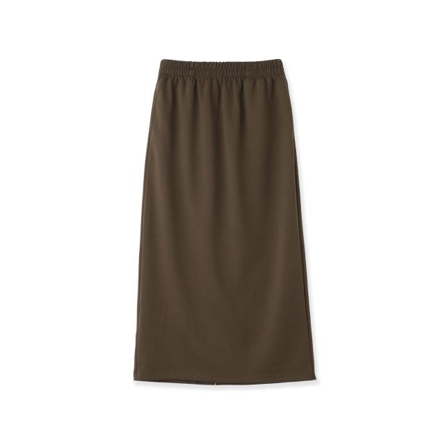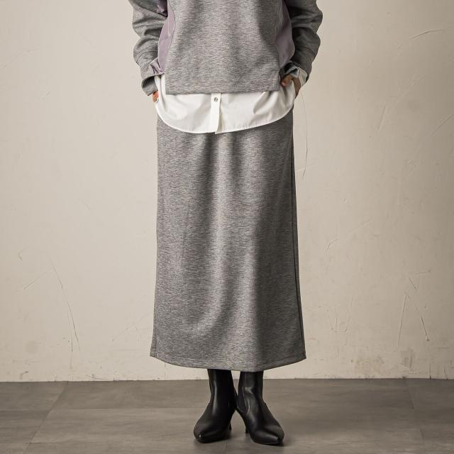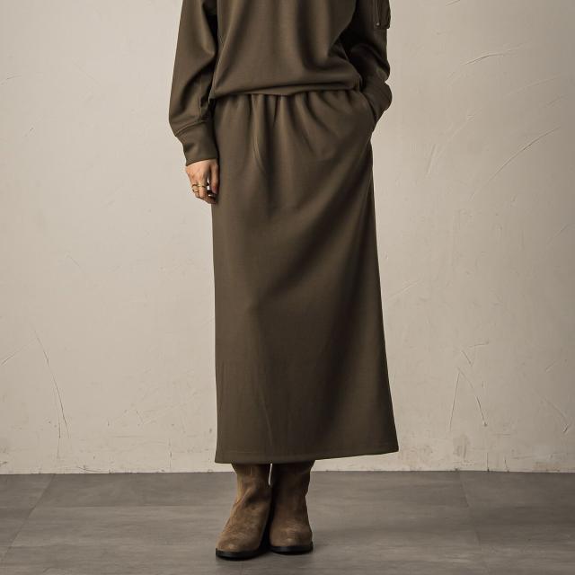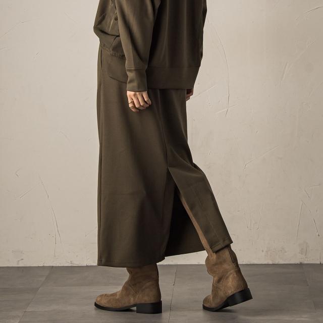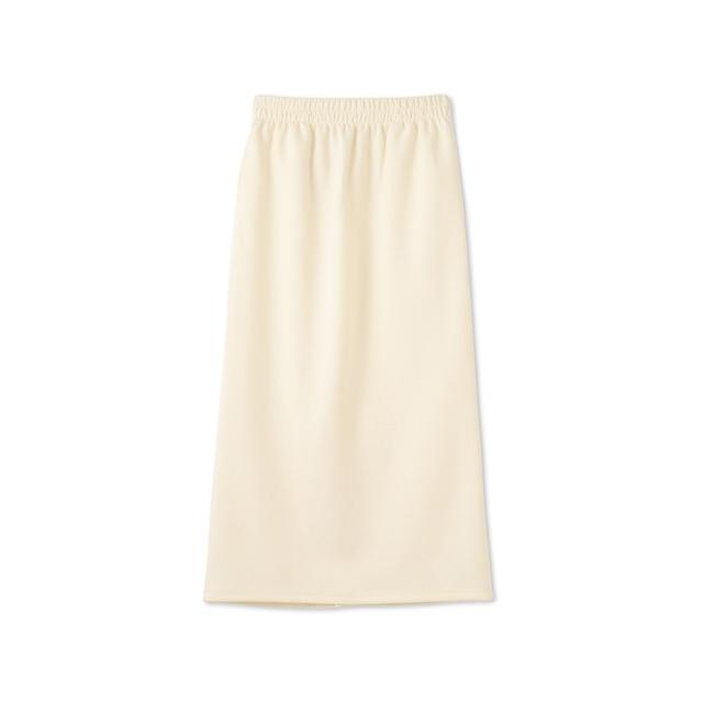 スカートは、ラインを拾いにくいほどよいIラインシルエットと、楽にフィットするウエストゴム仕様がポイント。
