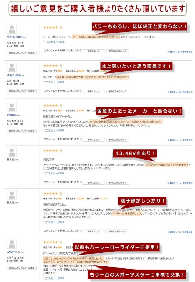 大排気量エンジンに息吹を注ぎ込むスターターモーターを回すには 従来の同格バッテリーではバッテリーの消耗が激しく1年と持たずに寿命を迎えてしまうこともありました。 これは、バッテリーに問題があるのではなく『ハーレー』というバイクが特殊だからなのです。 ハーレー用バッテリーはコールドクランキングアンペアー(CCA)値が大きくバッテリーサイズが同様であってもこの数値が下回るバッテリーを用いることで消耗スピードが上がり寿命を迎えてしまうのです。 アイネットではハーレー純正品と同様に鉛量を増やしCCA値を純正同等クラスまで引き上げたのです。 振動に耐えうる耐久性が重要 何故耐久性を要求されるのか?それはバッテリーの構造に由来します。バッテリーは単純に説明するとケース内で希硫酸と鉛が化学反応を起こし充電・放電を可能としています。前途したようにハーレー用のバッテリーとして鉛量を増やす事で重量が増え耐久性が必要となります。また振動により内部の鉛が脱落しないような構造でなくてはならないのです。 他シリーズのF-1バッテリーでは国内バッテリーメーカー同様のケース素材を使用していますが、ハーレー専用バッテリーでは材質を見直し内部構造をハーレー専用設計とする事で耐久性を飛躍的に向上させています。 更に接続端子についても振動対策構造とし、使用するボルトに関しては緩み止め加工を施し徹底しました。 ハーレー純正バッテリーに引けを取らない安心感を アイネットではF-1バッテリーを2009年より発売スタート国内一流某メーカーOEMもお受けしています。 年間販売数は約2万個と多く【ヤフー・楽天】ユーザー様から沢山のレビューで高評価をいただいております。 しかし残念ながら正直にお話すると不良発生は0では御座いません。0.4%の不良発生率、これは0.3%のユアサに限りなく近い数値となっています。当然この現状に満足するものではありませんが、アイネットでは出荷前に必ず初期充電及びテスター計測により数値化したデータを元に検品後に出荷しております。 ハーレー専用バッテリーの開発スタートから耐久テストに2年の歳月を要し、ようやく出来上がったアイネットが自信を持ってハーレーユーザー様にお届けする【1年保証】バッテリーなのです。 |