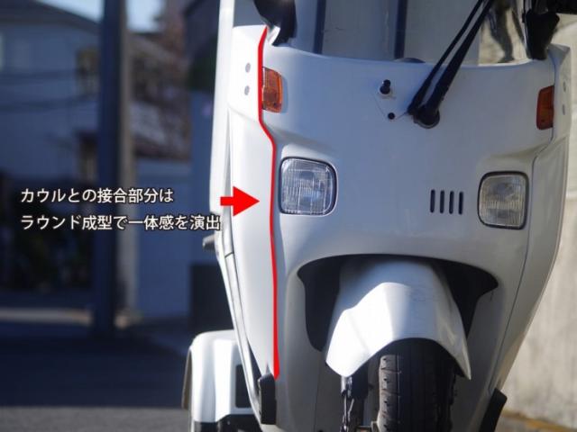 フロントカウルとの接合部分は切りっぱなしのままでは車体との一体感がないためラウンド成型を採用しました。