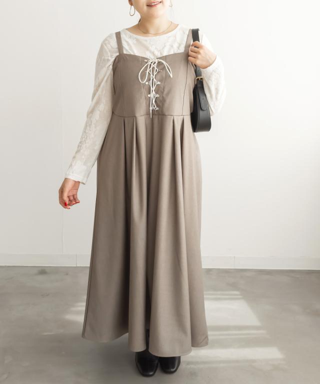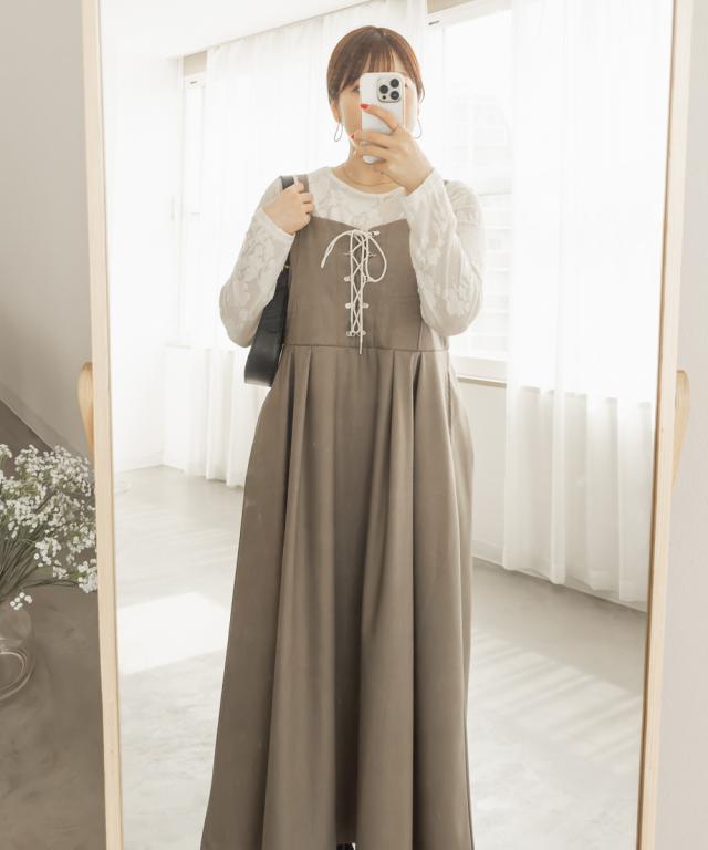 | 3Lを着てちょうどいいサイズでした。後ろゴムだったり楽に着られる仕様だったので着やすい1枚です◎上半身部分はすっきりとしていながら、スカート部分は綺麗に広がるからフィット&フレアですっきり着やせできます!少しハリのある生地なのでボディラインを拾いずらいのも嬉しい!レースアップデザインで甘くなりすぎずに、おしゃれ感も楽しめるワンピースなのでインナーを変えて色々な着こなしを楽しめそうです! |
