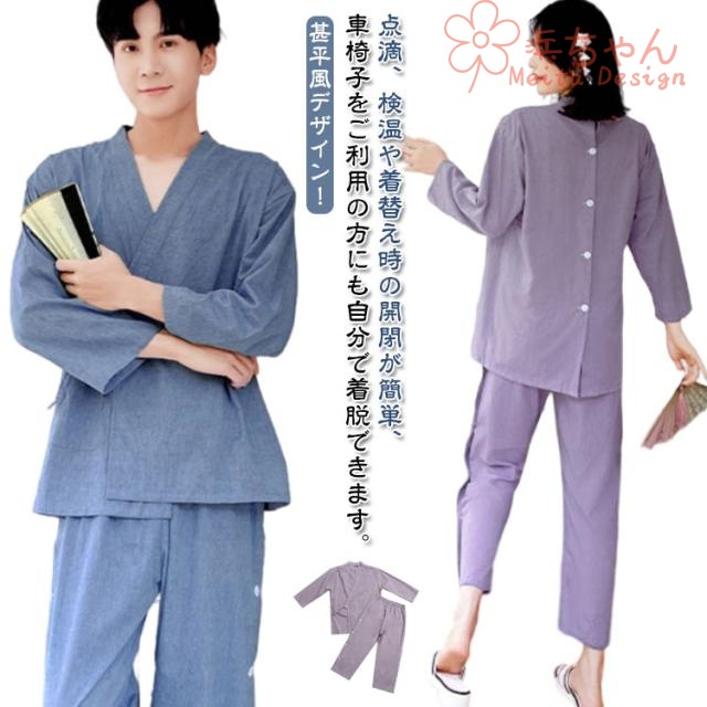 | 甚平風デザイン!点滴、検温や着替え時の開閉が簡単、車椅子をご利用の方にも自分で着脱できます。 体不自由な方や着替えが困難な方をサポートする介護用パジャマです。 寝たり座ったりの状態でも着脱が簡単。 肌ににストレスを与えず、心地よく眠るための工夫をこらしたパジャマです。 快眠を与えるための要素を備えた綿素材で春夏秋冬、一年中過ごしていただけます。 エアコンの効いた施設(病院など)にも最適!お肌の弱い方や敏感肌の方も気楽に着られます。 | |
