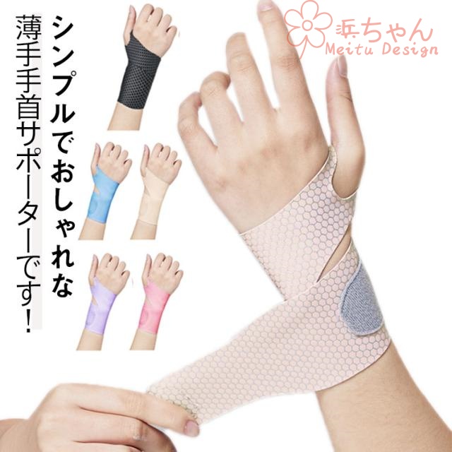 | シンプルでおしゃれな薄手手首サポーターです! 親指を専用穴に通し、テーピングを巻くように手首の太さに合わせてしっかり固定することができます♪ マジックテープで圧迫の強さなどを自由自在に調節可能。 色やデザインがやさしい見た目なので場所を気にせずにご使用いただけます。 手洗い可能なので清潔にお使いいただけます。 日常生活、家事・育児、パソコン作業、仕事、スポーツ時などに手首をサポートします。 | |