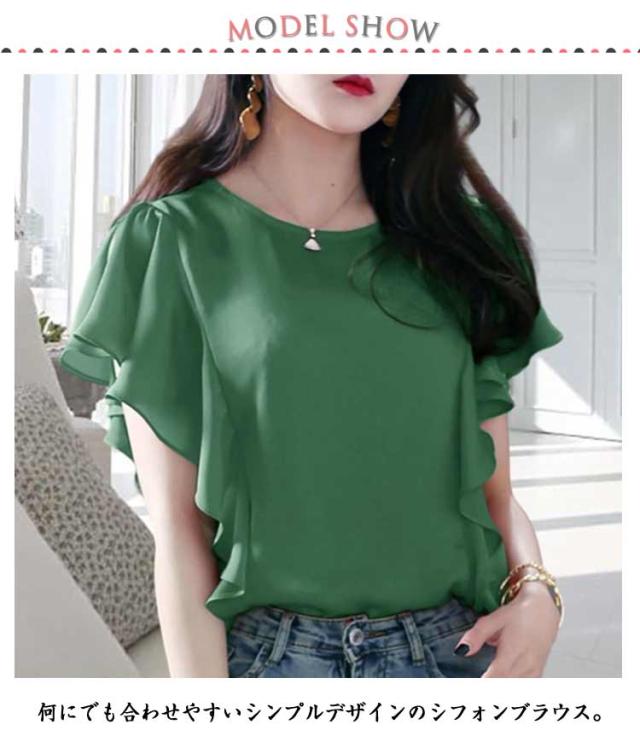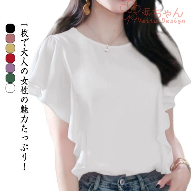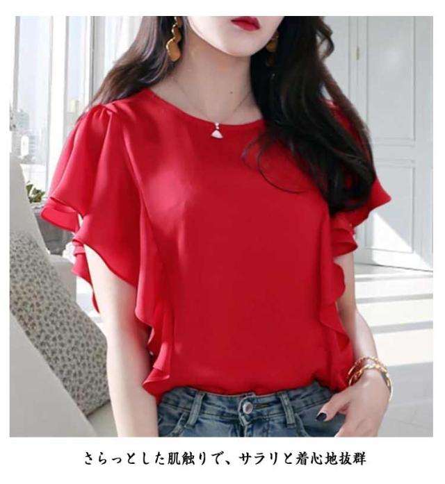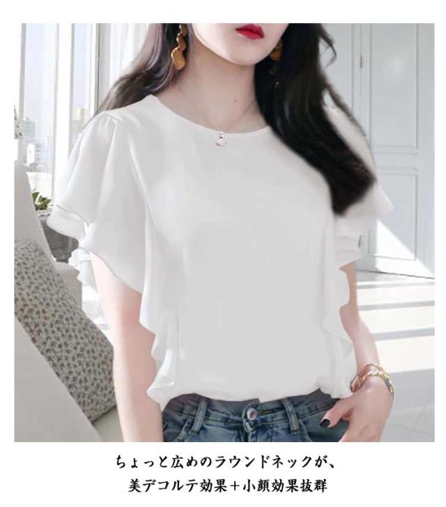 クルーネック シフォン ブラウス シャツ フリル袖 チュニック 無地レース フリル袖カットソー シンプル 半袖 Uネック レディース 夏 結婚式 二次会 シフォン パーティー トップス フォーマル 薄手