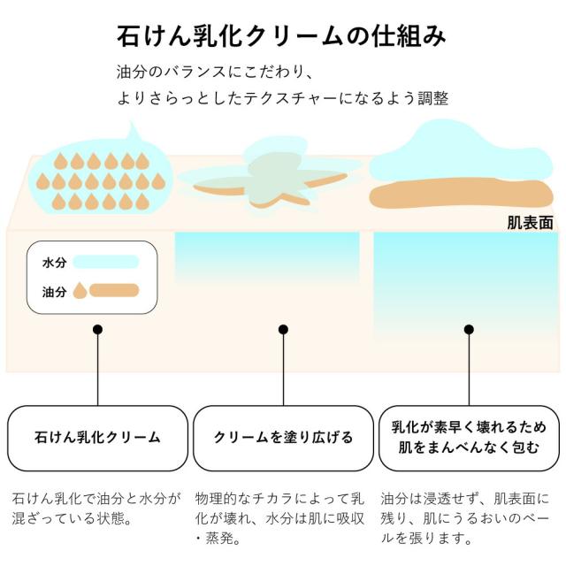 人間の皮脂に近いオレイン酸をたっぷり含む「ハイブリッドヒマワリ油」など、天然由来の保湿成分を9種類配合。保湿しながらも、ベタつかないシルキーな感触を実現。水に触れる機会の多い、料理家、美容師、お花屋さんにもおすすめ。 | 油脂のプロが独自製法で生み出した石けん乳化技術 一般的に、油性成分と水溶成分を均一に混ぜ合わせる乳化には、合成界面活性剤を乳化剤として使用していることがあり、肌トラブルの原因と指摘されることもあります。 ※全ての商品に使用されているものではございません。