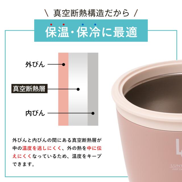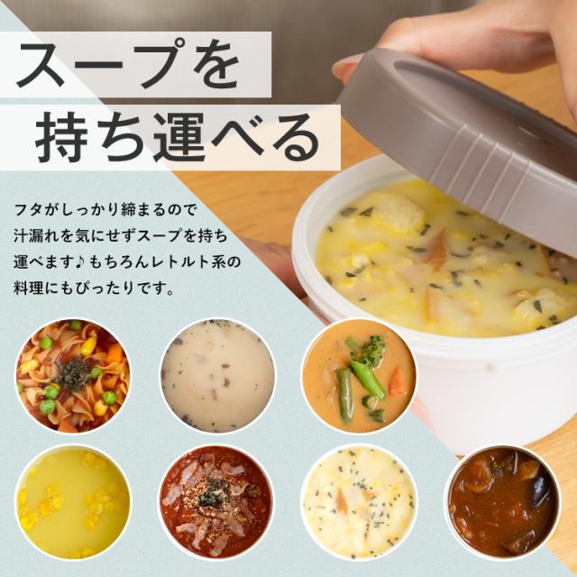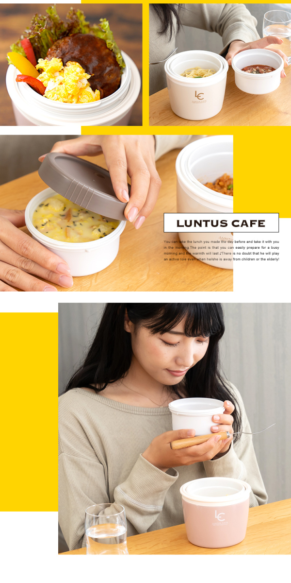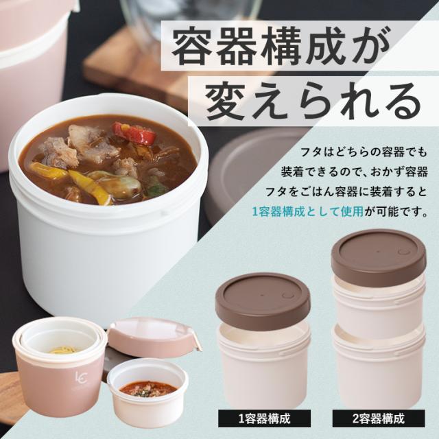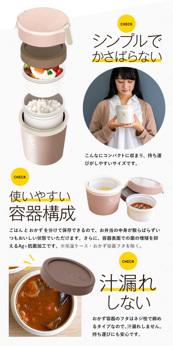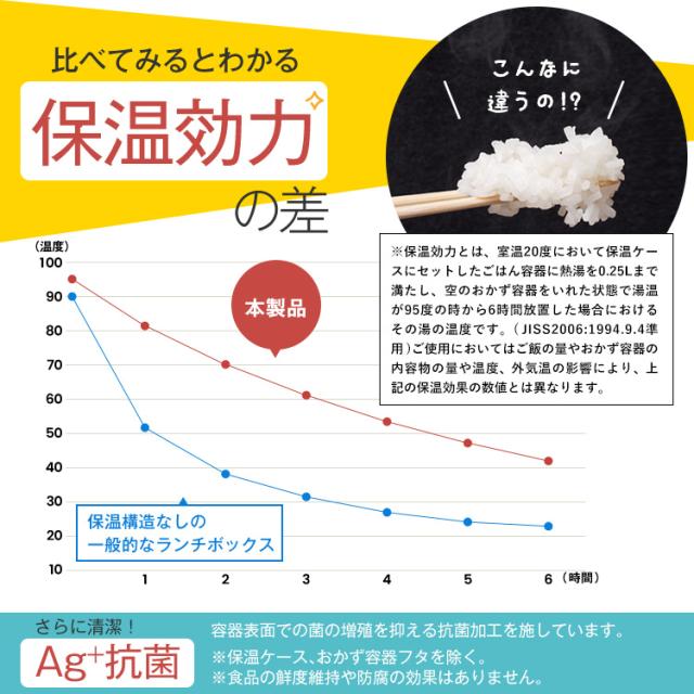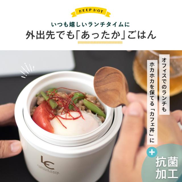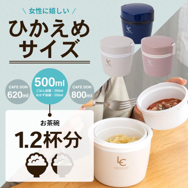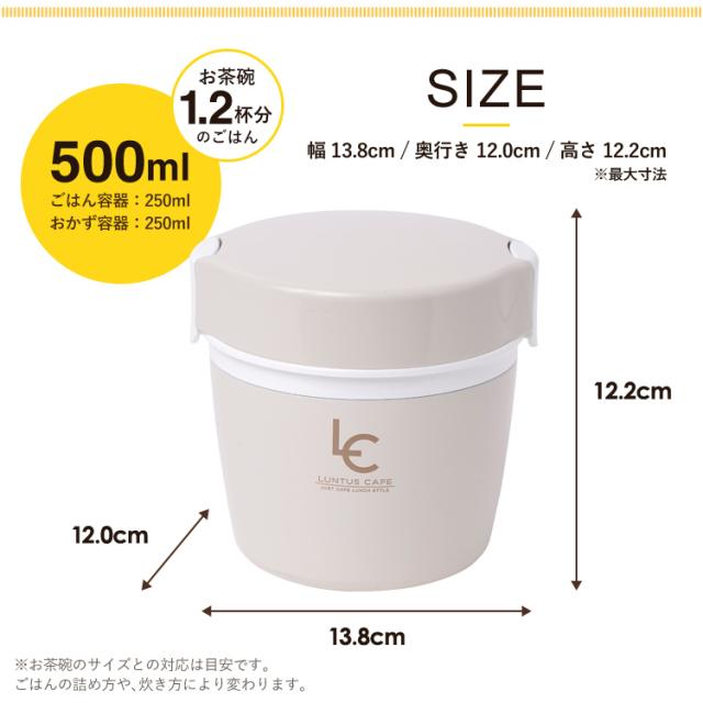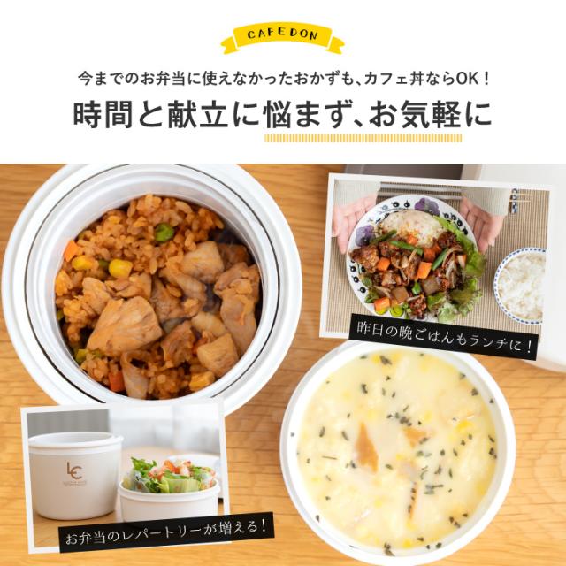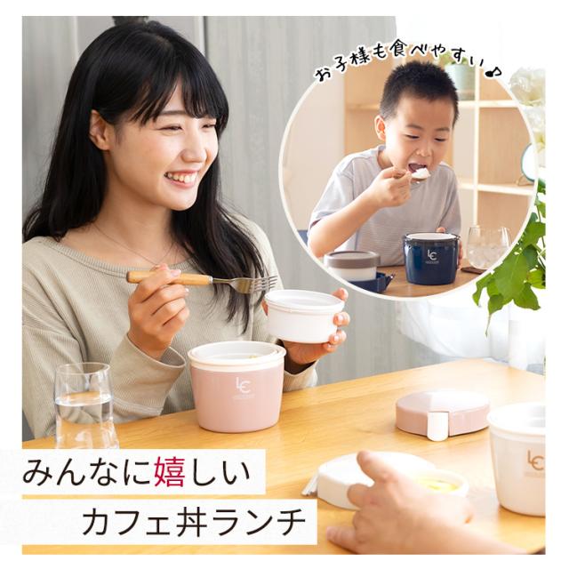 いつでもどこでも温かご飯が美味しく食べられるカフェ丼ランチ。ステンレス真空断熱構造で、保温・保冷で、中身の温度を保ちます。丼タイプなので、カレーや親子丼、パスタなど、お弁当のバリエーションが広がります。保冷もできるから、暑い夏にも冷製メニューにも。丼ぶり形状で、お子様でも食べやすく、おかずも詰めやすいので、お母さんも大助かり。食洗器にも対応、忙しい家事の短縮にも。レンジで、温め直しもできます。控えめサイズ500mでダイエットにも最適。容量 : 500ml ( ごはん 250ml おかず 250ml )サイズ : 幅13.8×奥行12.0×高さ12.2cm材質 : 保温ケース=ステンレス鋼(アクリル樹脂塗装) 保温ケースフタ=ポリプロピレン(中材:発泡PP断熱材) 止め具・リング・おかず容器本体・ごはん容器本体・中フタ・弁本体=ポリプロピレン パッキン・エア弁=シリコーンゴム