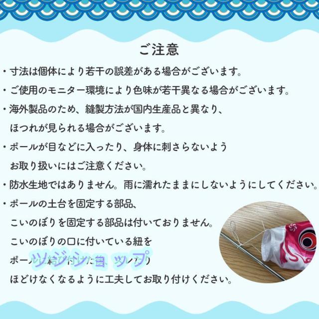 ・ポールの土台、固定する部品は付いておりません。また、こいのぼりを固定する部品も付いておりません。こいのぼりの口に付いている紐をポールに結び付けた後、ズレたりほどけなくなるように工夫してお取り付けください。