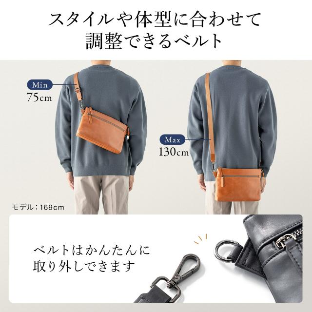⇒ご購入の前にご確認下さい使うほどに馴染む。本革製4WAYサコッシュ。サコッシュ・ショルダーバッグ・クラッチバッグ・バッグインバッグの4WAY仕様。上質な牛本革製で、しっとりと手に馴染む手触り。適度にやわらかく使いやすい。長財布やiPad(11インチ以下)も入るサイズ。ポケットが4つ付き。【WEB限定商品】