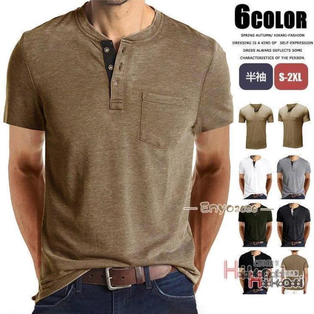 【大特価】ヘンリーネックTシャツ メンズ Tシャツ 半袖 無地 胸ポケット付き カジュアル トップス シンプル おしゃれ
