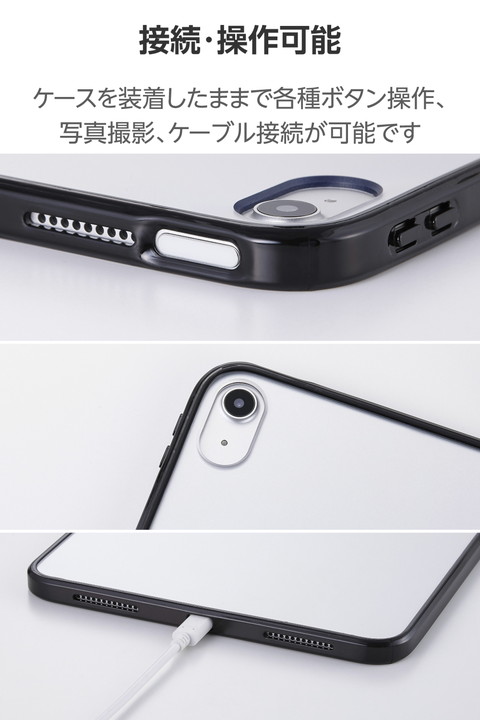 エッジ部分のカラーがアクセントとなる軽く、衝撃に強いクリアケースです。背面は透明感と艶が美しいクリア素材を採用。側面に弾力性のあるTPU素材を、背面に指紋が付きにくいポリカーボネート素材を使用しました。