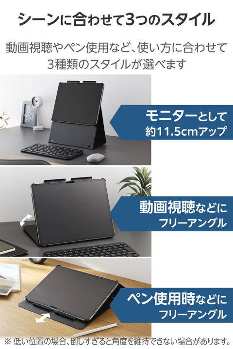 モニターとして使える!端末を高い位置で固定できるフラップケースです。動画視聴やタイピングなどのシーンに合わせて自由にスタンドの角度を変えられます。![]() ■モニターとして使える!端末を高い位置で固定できるフラップケースです。 ■端末を最大約11.5cmまで上げることができるため、目線の高さに合わせられます。モニターとして使うときにも便利です。 ■動画視聴やタイピング、ペン使用時などのシーンに合わせて3つの使い方が選べます。 ■高さを低い位置で設定した場合、角度は自由に調整できます。 ■※低い位置で固定する場合、倒しすぎると角度を維持できない場合があります。 ■※高さを高い位置で設定する場合は、角度の調整ができません。 ■持ち歩き時に画面を保護するフラップ付きです。フラップを閉じるとスリープモードになり、開けるとスリープから復帰します。 ■フラップはマグネットで簡単に留めることができます。 ■傷や汚れが付きにくく、高級感のある合成皮革素材を使用しています。 ■ケースを装着したままで画面の確認、充電、各種ボタン操作、写真撮影が可能です。 ![]() ■対応機種:13インチiPad Air(M3)、13インチiPad Air(M2) ■対応モデル番号:A3271、A3269、A3268、A2900、A2899、A2898 ■セット内容:ケース×1 ■材質:表面:合成皮革、裏地:ポリエステル、本体装着部:ポリカーボネート ■カラー:ブラック ■サイズ:幅約228mm×厚み約15.5mm×高さ約285mm ■重量:約575g |