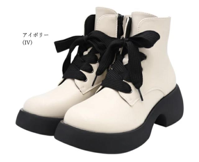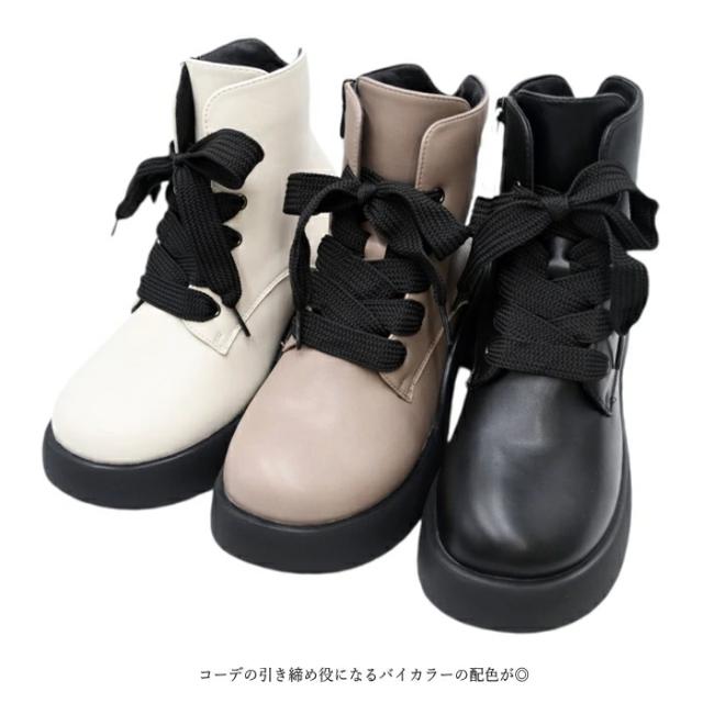 厚底モールドソールを使ったレースアップブーツ。どこか懐かしさのあるオブリークトゥと太めの平紐がリボンのような可愛らしさを添え、足元にさり気ない個性を演出します。アッパーはやわらかな色味ながら、シューレースやソールに黒を効かせた配色で、ほんのりモードな表情に。ガーリーとクールのどちらの空気もまとえる、いいとこ取りな1足です。