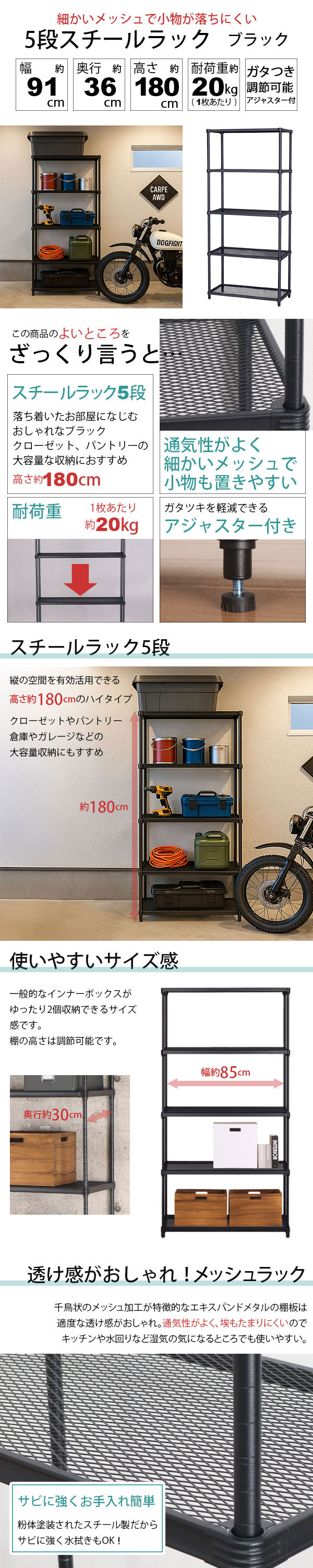 商品名:物が落ちにくい スチールラック 5段 (約)幅90cm 奥行35cm 高さ180cm メッシュ棚板 収納棚 スリム メッシュラック ブラック 黒 おしゃれ 頑丈 棚板耐荷重20kg オープンラック 隙間収納 キッチンラック ガレージ 高さが変えられる棚 アジャスター付き 1個単品 EPR-9018