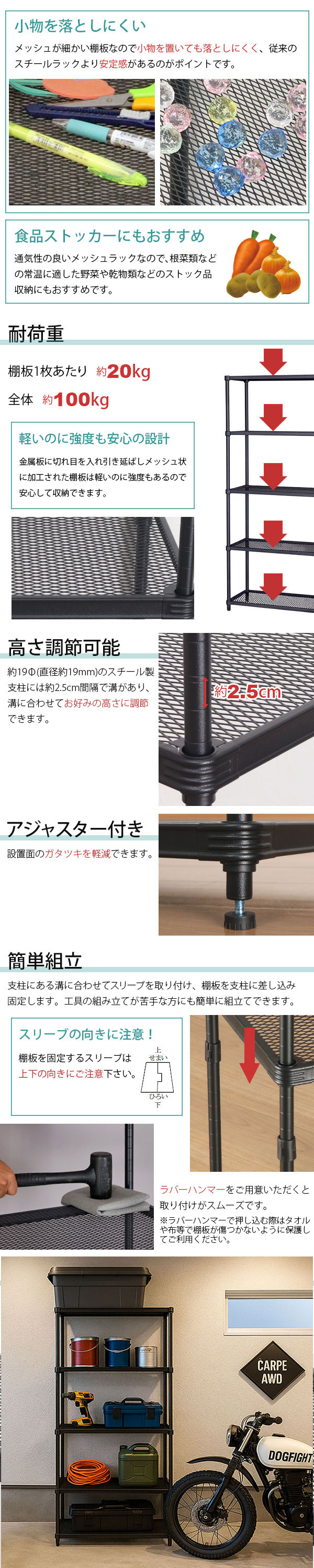 メッシュが細かい棚板なので小物を置いても落としにくく、従来のスチールラックより安定感があるのがポイントです。