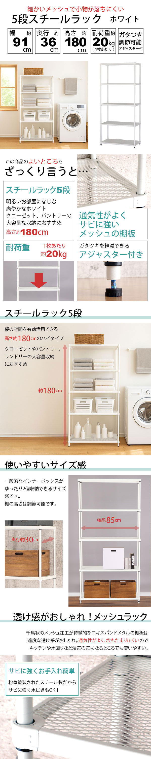 商品名:物が落ちにくい スチールラック 5段 (約)幅90cm 奥行35cm 高さ180cm メッシュ棚板 収納棚 スリム メッシュラック ホワイト 白 おしゃれ 頑丈 棚板耐荷重20kg オープンラック 隙間収納 キッチンラック ランドリー収納 高さが変えられる棚 アジャスター付き 1個単品 EPR-9018 家具 インテリア 収納家具 棚 収納ラック メッシュ 棚 網目 高さ調整 五段ラック マルチラック フリーラック 多目的ラック 整理棚 オープン棚 オープンシェルフ スチールシェルフ 物が倒れにくい スリムラック キッチン収納棚 レンジ台 レンジラック 家電収納 キッチンストッカー リビング収納 玄関ラック 玄関収納 ランドリーラック 洗剤収納 洗剤 ストック プリンターラック プリンター台 本棚 ディスプレイラック 飾り棚 コレクションラック 小物収納 おもちゃ 雑貨 フラワースタンド 花台 プランターラック サイドラック コンパクト 省スペース 丈夫 シンプル モダン スタイリッシュ かっこいい 新生活 一人暮らし ワンルーム キッチン 台所 居間 ダイニング 子供部屋 洗面所 脱衣所 サニタリー クローゼット 押し入れ パントリー 納戸 物置 倉庫 ガレージ すっきり 片付け 組立簡単 通気性 可動棚 ポール径19mm ガタツキ防止 マット加工 マットホワイト 白い棚